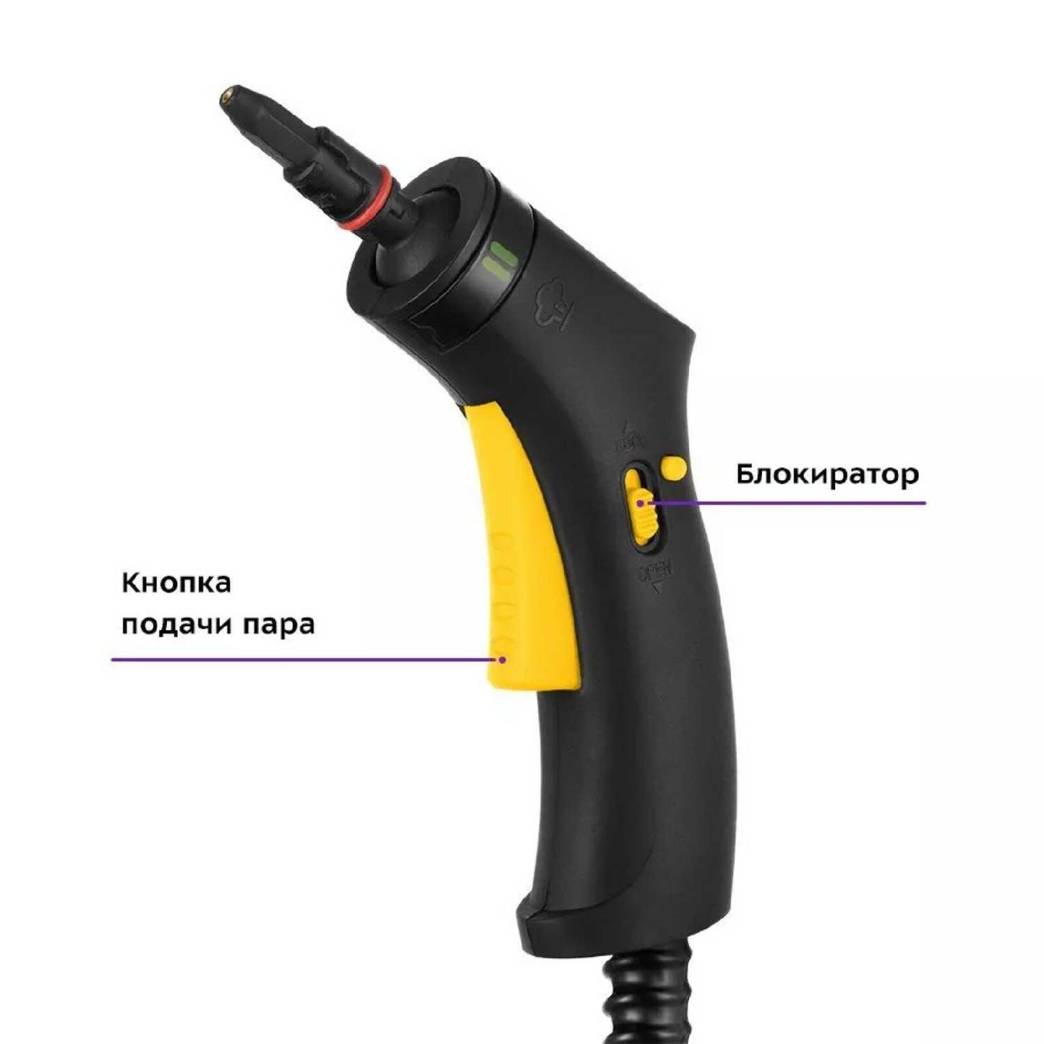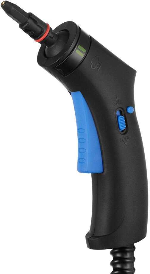 - Эргономичная ручка с блокировкой подачи пара обеспечивает стабильный хват, предотвращая случайное включение и повышая безопасность при перемещении.