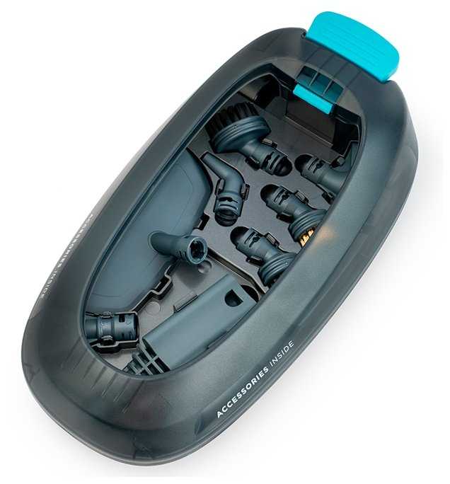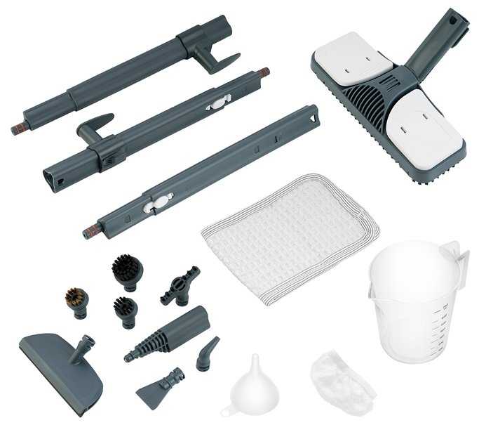 - 16 насадок в комплекте: щелевые для труднодоступных мест, круглые щетки для плитки, скребок для окон, латунная щетина для духовок.