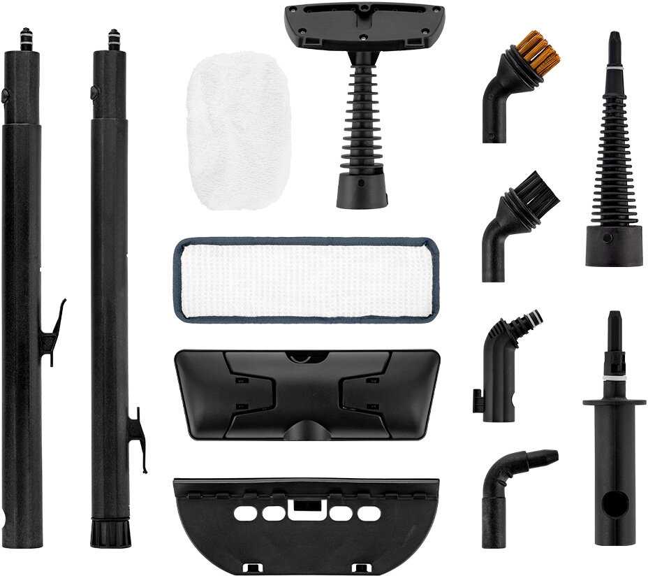 - В комплекте множество насадок, включая швабру, точечные и для пола, что позволяет чистить весь дом от кухни до ванной.