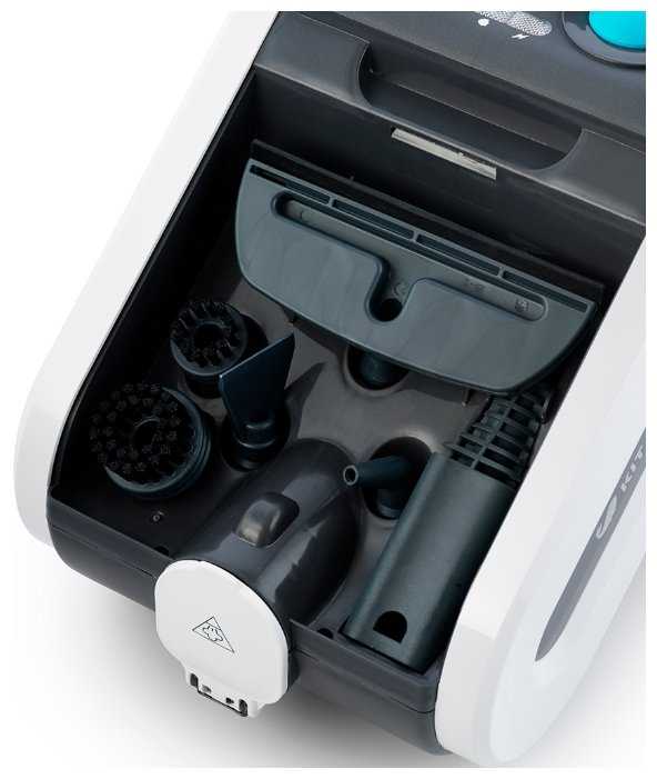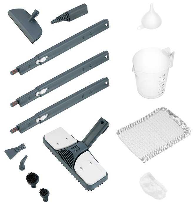 - Включает щетки для пола, струйную насадку, скребок для стекол, угловую насадку и др.