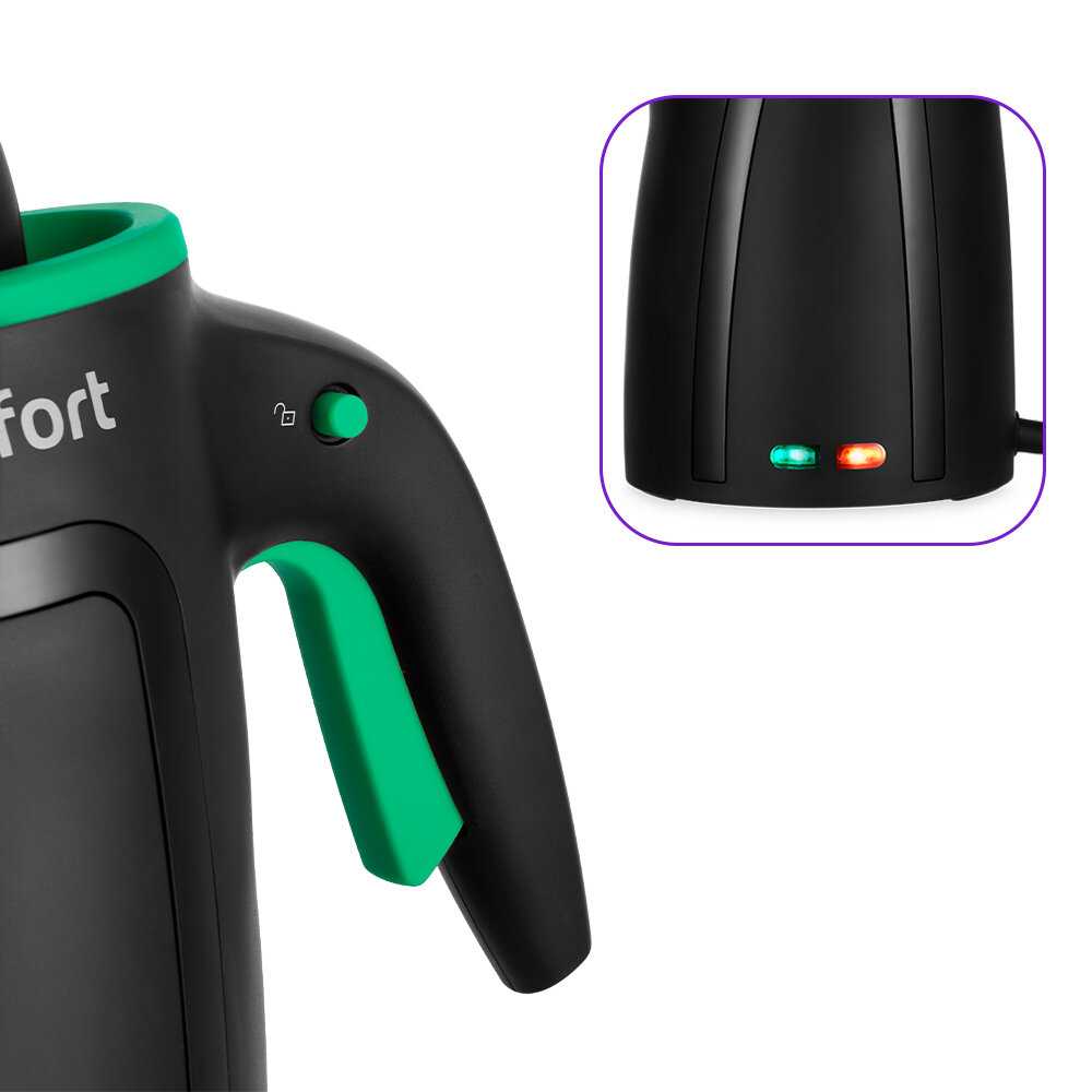 - - Нет индикатора жидкости: от этого иногда происходит перелив, иногда после окончания нагрева при переливе плюётся чуть чуть, а не выдаёт пар. Неудобный зажим для подачи пара: приходится одну руку использовать как педаль, второй рукой держать шланг. (можно продумать удобство в постановке самого аппарата на пол и просто шлангом чистить что то, потому что иногда есть потребность что то отодвинуть и тд, то есть нужна свободная рука)