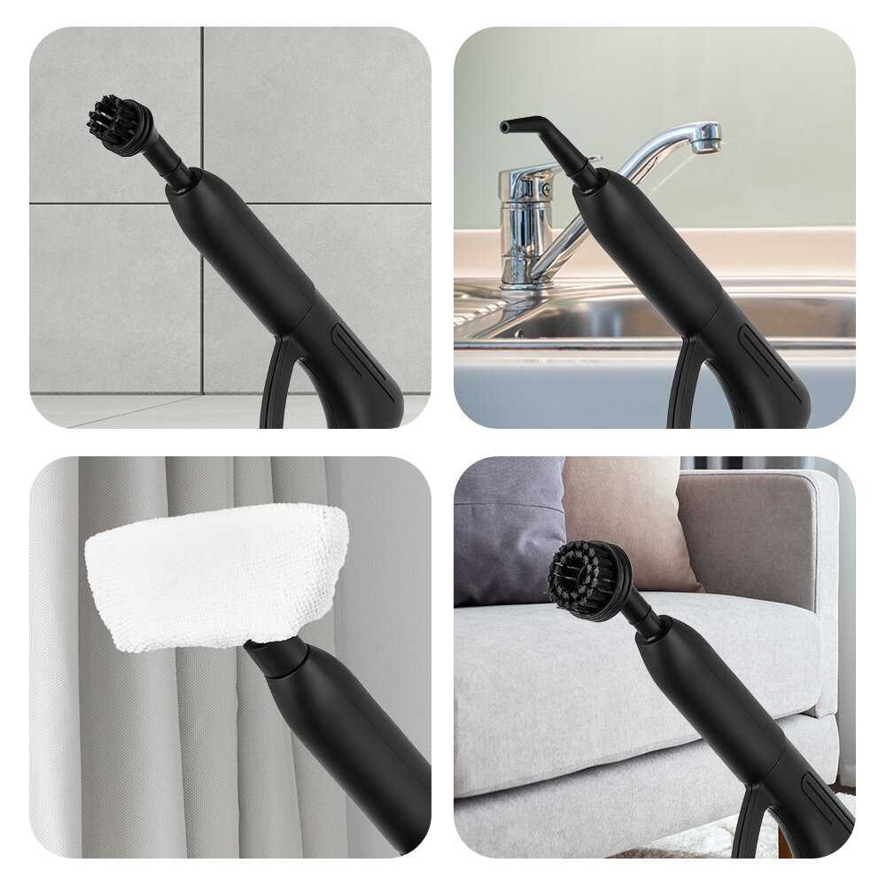 - + Большое количество насадок. Удобно устроено хранение внутри корпуса (есть специальные выемки). Качественный пластик у самого пароочистителя, трубы, насадок. Объёма воды хватает на хорошую уборку. Нагревается быстро