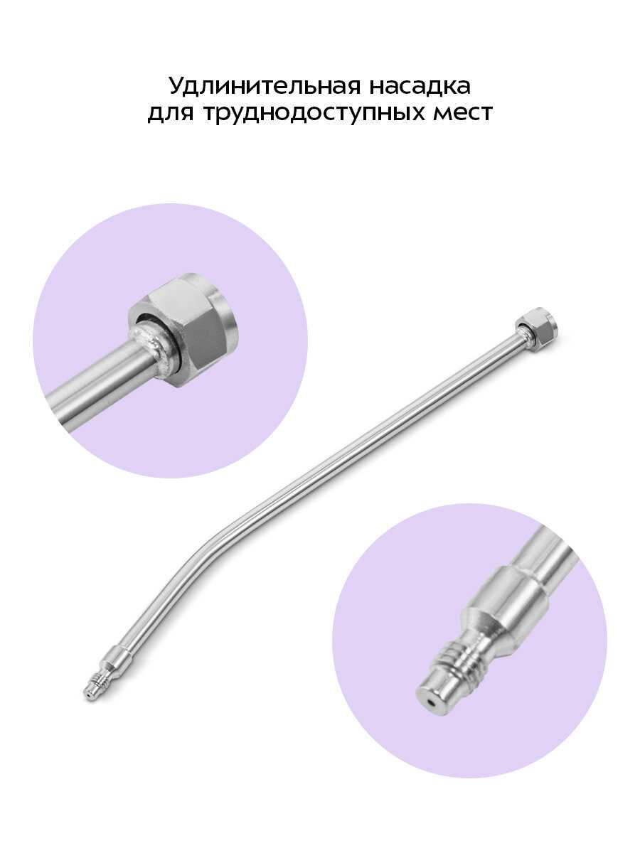 Хорошо удаляет загрязнения в труднодоступных местах. Удобный, компактный, быстро нагревается. Воду налил, включил и пошёл. Длинны шланга хватает с запасом.
