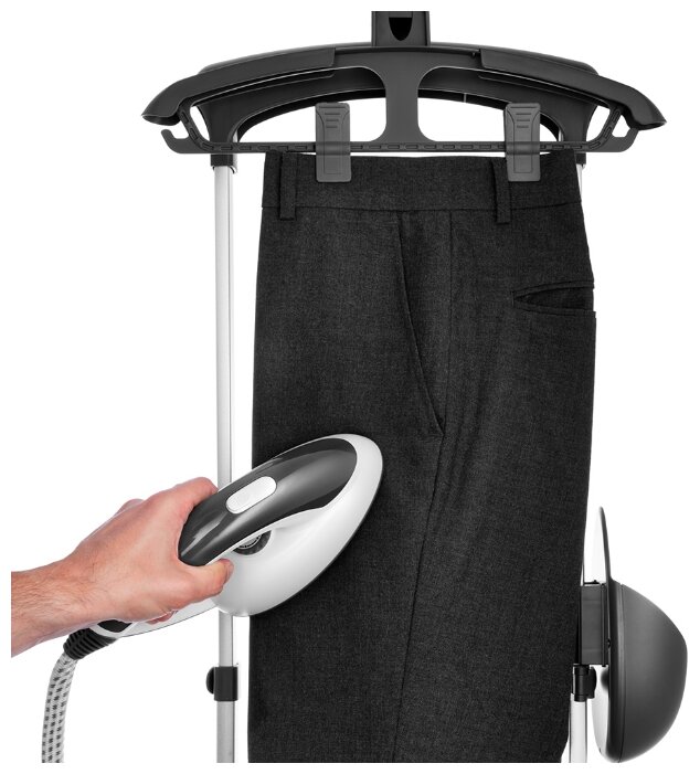 Приобретали эту модель из-за возможности вертикальной и горизонтальной глажки. Со своей задачей справляется на ура. Наличие плечиков и зажимов для брюк хорошо облегчает глажку. Пар достаточно мощный, нагревается очень быстро. Но емкость для воды неудобная. Сливная пробка находится снизу, из-за чего приходится разбирать отпариватель и нести его в ванную, либо выпускать пар, пока вода не кончится. Отдельный контейнер для воды в других моделях выглядит удобнее. Если кончается вода и требуется доливка, то необходимо ждать, пока ёмкость не остынет, иначе при доливке есть шанс получить ожог от вылетающих брызг.