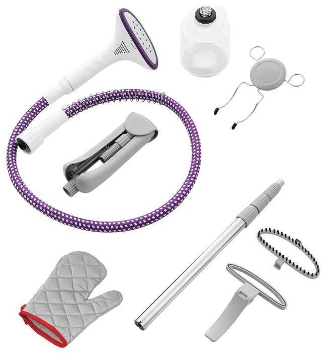 - Включает термоварежку для защиты от ожогов, насадки (щетка для ворса, зажим для брюк), что упрощает работу с разными тканями.