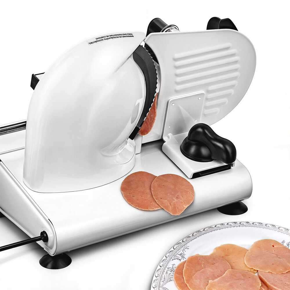 Универсальность применения и рабочие характеристики: Ломтерезка демонстрирует высокую степень универсальности при работе с продуктами различной плотности и структуры. Наилучшие результаты, согласно отзывам, достигаются при нарезке твёрдых и полутвёрдых продуктов: сырокопчёной колбасы, твёрдых сыров, бастурмы, огурцов и даже слегка подмороженного мяса, где она обеспечивает идеально ровные и тонкие ломтики. С мягкими овощами и фруктами, такими как помидоры, бананы и мягкие сыры, устройство также справляется, но может потребовать определённой сноровки или предварительной обработки ножа маслом для предотвращения прилипания. Важной эксплуатационной характеристикой является возможность обработки незамороженного мяса, хотя для получения наилучшего среза пользователи всё же рекомендуют его предварительно подморозить. Скорость вращения ножа оценивается как достаточная для домашнего использования, однако некоторые пользователи выражают пожелание о её увеличении для более интенсивных нагрузок. Устройство не подходит для нарезки очень жёстких продуктов, таких как тыква, из-за конструктивных особенностей задней части корпуса, которая может препятствовать прохождению жёсткого ломтя. Отсутствие встроенного поддона для нарезанных продуктов является заметным недостатком, требующим подстановки внешней ёмкости, что не всегда удобно из-за выступающей конструкции.
