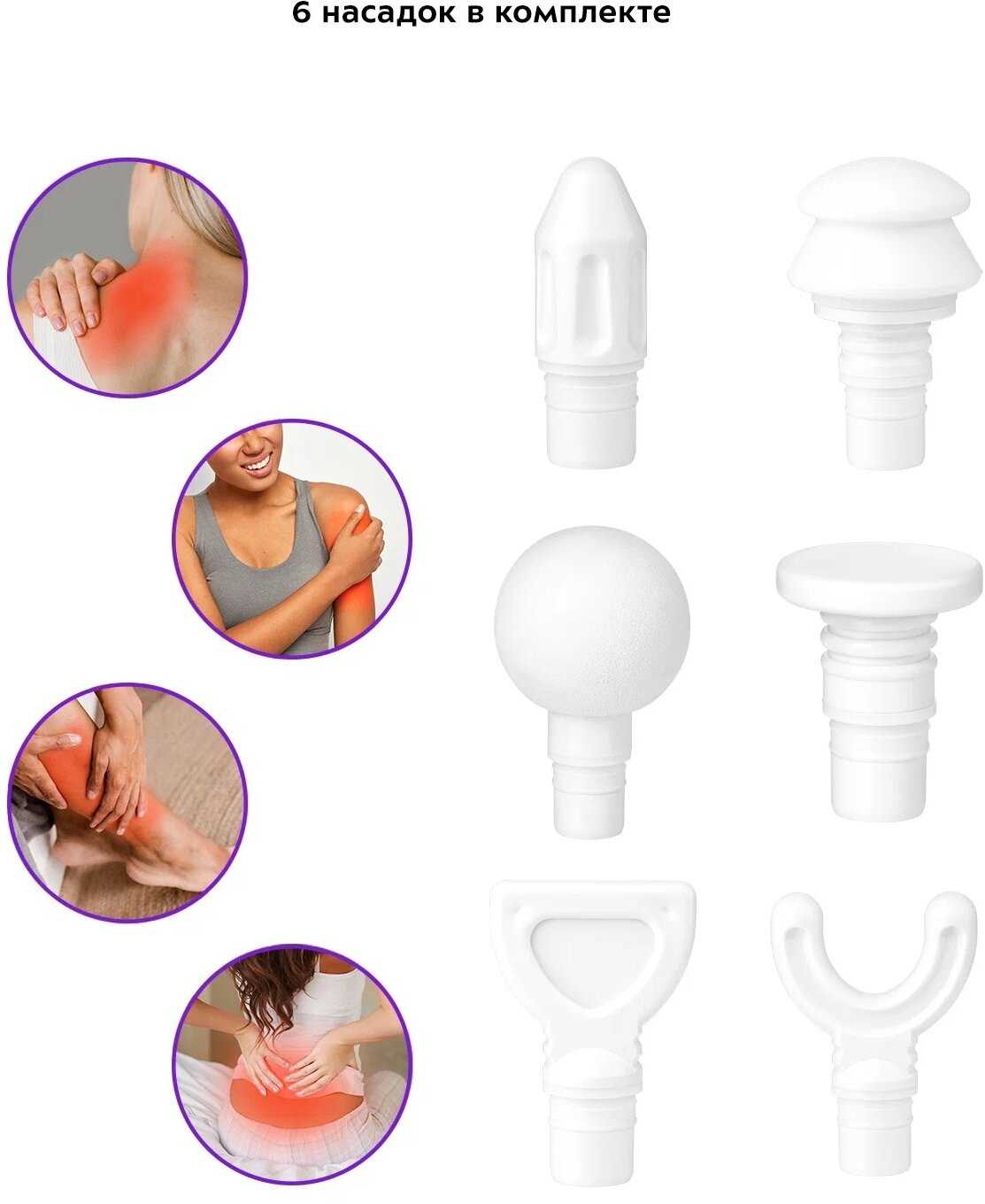В комплекте шесть специализированных насадок: Y-образная (для позвоночника и крупных мышц), плоская (широкие зоны спины), круглая (общий массаж), пулевидная (точечное воздействие), лопатка (плоские поверхности) и компрессионная (глубокие ткани). Инструкция четко описывает назначение каждой, позволяя адаптировать массаж для ног, рук, ступней, плечевого пояса и даже бедер. -