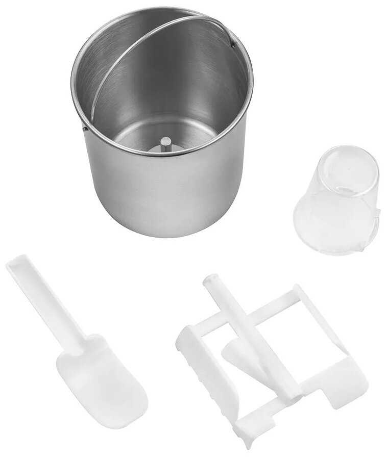 Производитель включает мерный стакан (200 мл) и пластиковую лопатку для извлечения мороженого. Стакан удобен для точного отмеривания сливок, но не имеет отметок для мелких порций. Лопатка плохо счищает десерт с мешалки — пользователи советуют использовать силиконовый скребок. Место для хранения аксессуаров в корпусе не предусмотрено.