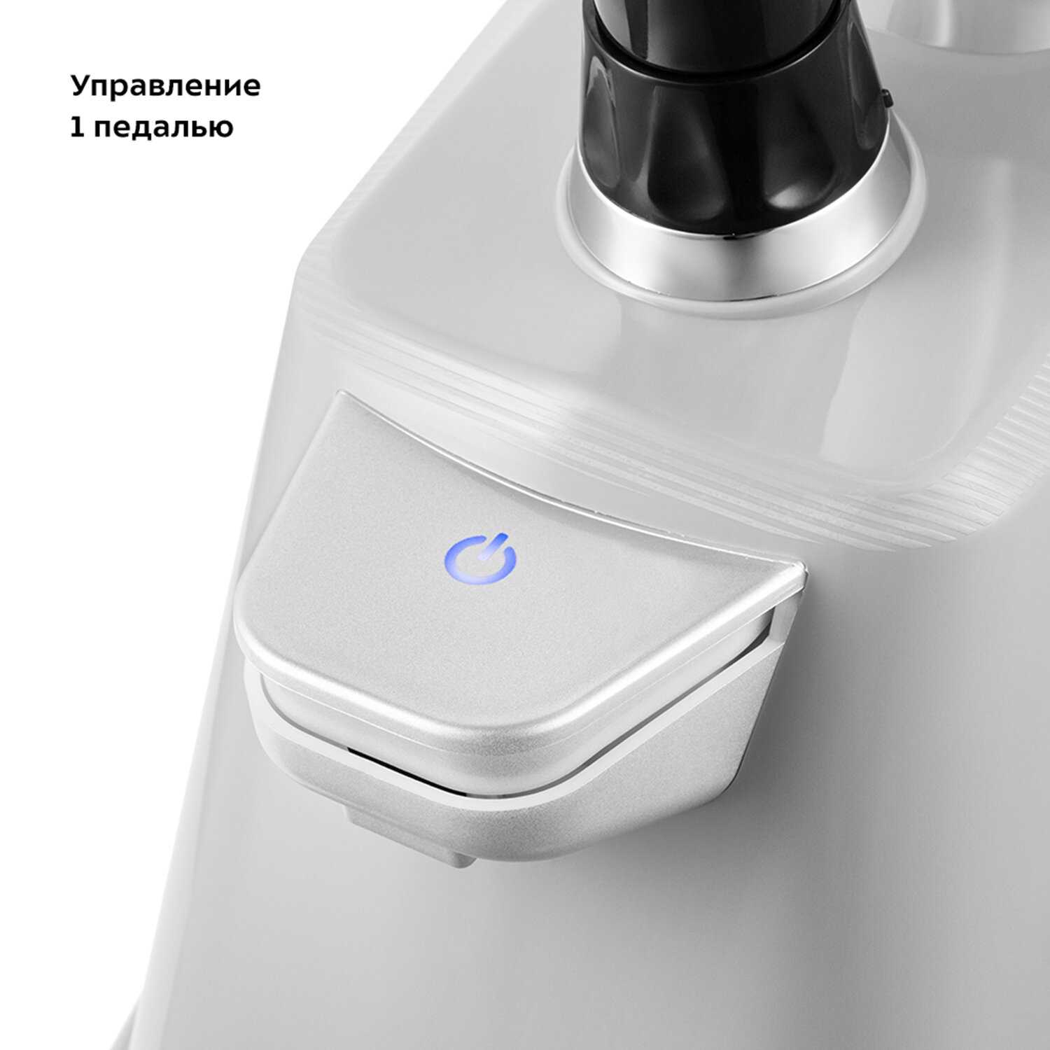 Высокий, можно отпарить даже шторы, не вставая на табурет. Удобно перемещать из-за наличия колёсиков. Включать и выключать нажатием ногой педали, это очень очень удобно.