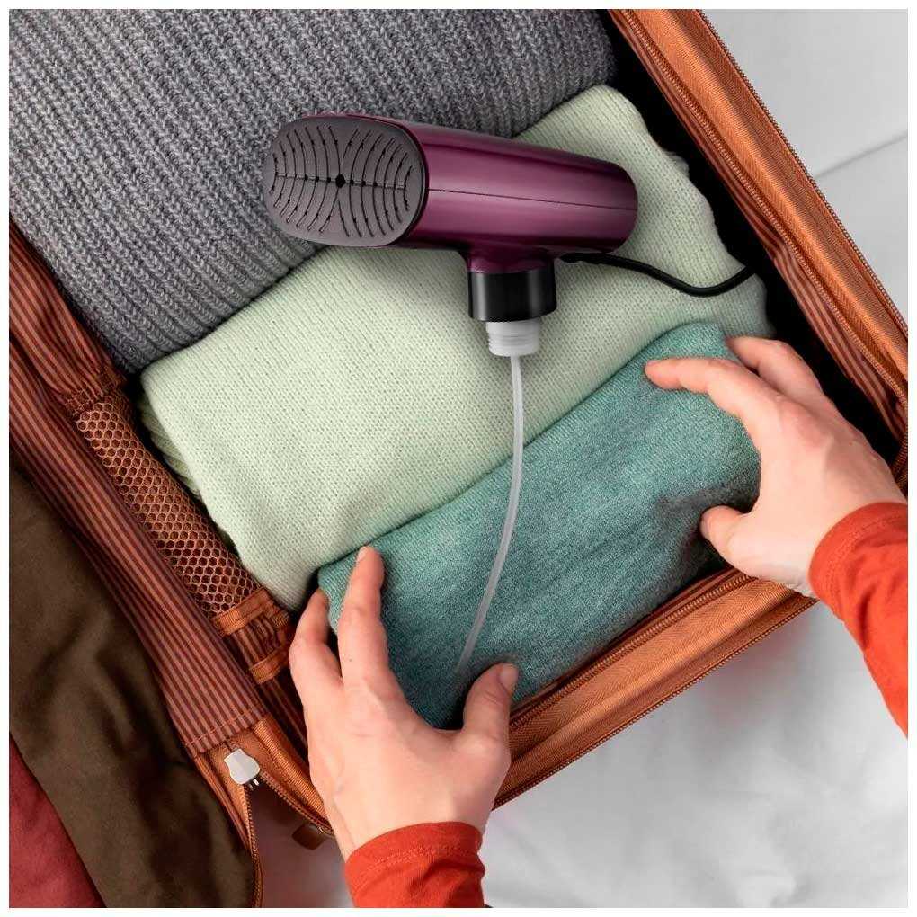 - + Хороший ручной отпариватель. Не тяжелый, удобно держать в руке. В комплекте есть сменный блок для бутылки, если родной емкости для воды мало. Компактный, что не мало важно, разбирается на 2 части, удобно перевозить даже в маленьком рюкзачке.