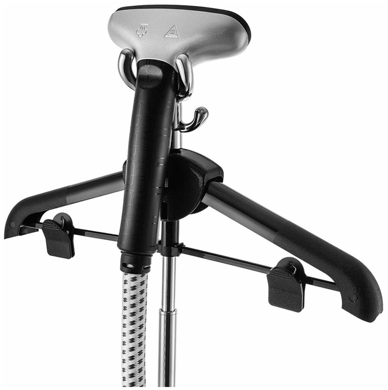 Телескопическая металлическая штанга позволяет адаптировать высоту под длинную одежду, например пальто или платья. Она устойчива и не шатается, обеспечивая надёжную фиксацию вещей во время обработки. Дополнительно вращающиеся плечики упрощают доступ ко всем участкам ткани без необходимости перемещаться вокруг устройства. -