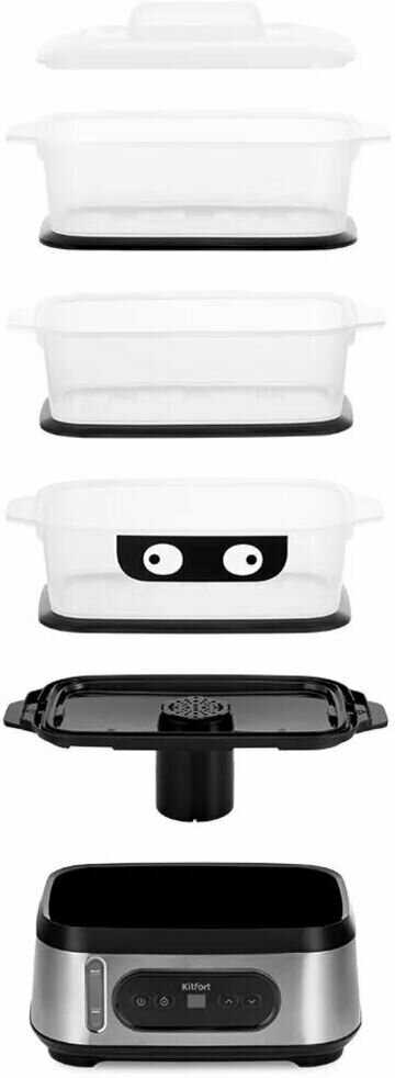 Три одинаковых по объему и взаимозаменяемых контейнера позволяют одновременно готовить несколько блюд, например, мясо, овощи и гарнир. Этого достаточно для полноценного приема пищи семьи из 3-4 человек. При необходимости можно использовать только один или два яруса, что удобно для приготовления небольших порций или отдельных блюд вроде омлета. -