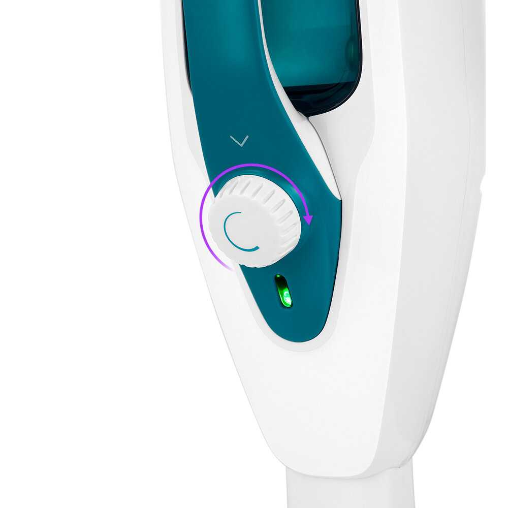 На рукоятке расположена кнопка плавной регулировки с 3 фиксированными положениями: минимальный (для деликатных поверхностей), средний (режим ежедневной уборки) и максимальный (удаление сложных загрязнений). При переключении режимов пар подаётся без задержек.