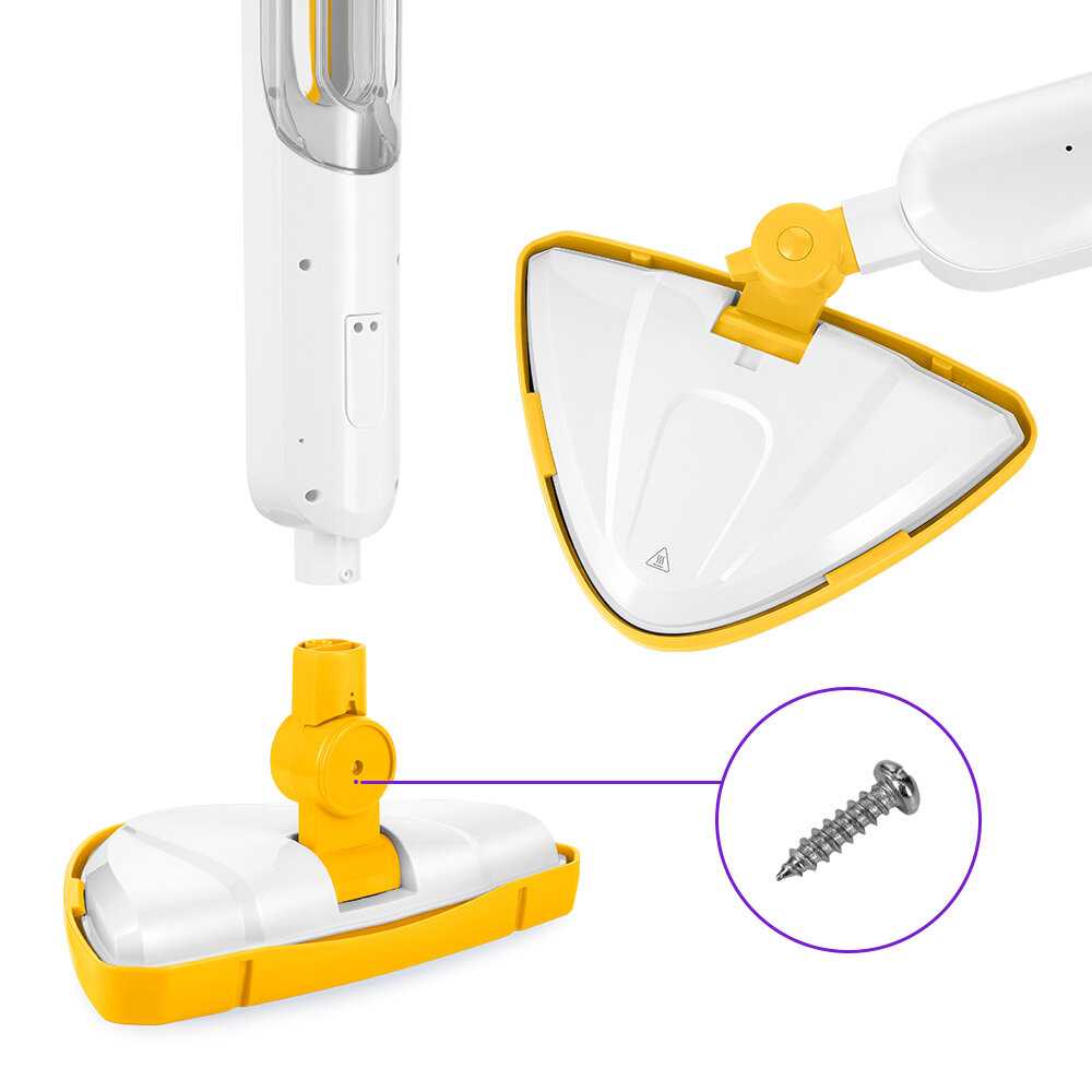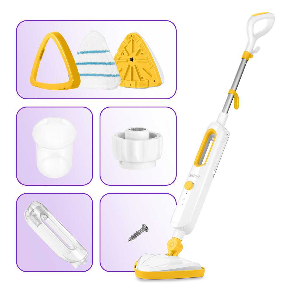 - Включает 2 тряпки, насадку для ковров, удлинитель, ручку, рамку; тряпки стираются в машинке.