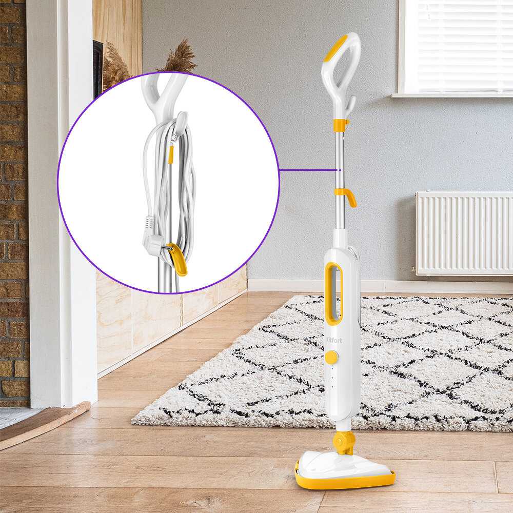 Паровая швабра порадовала своей мощностью. Эргономичная конструкция, очень удобное крепление под шнур (можно скрутить на самой швабре. Тряпка держится надежно, на что жалуются в других моделях. Удобная манёвренность тряпки.