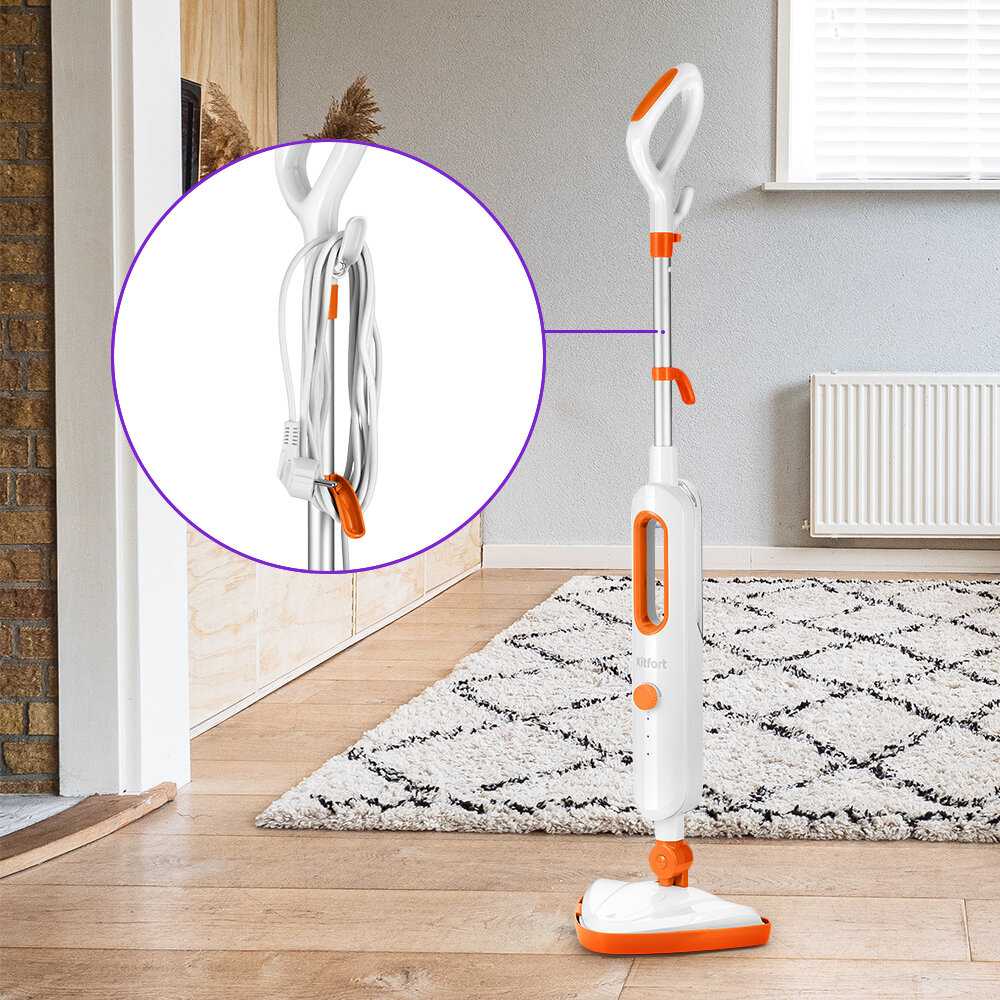 Паровая швабра порадовала своей мощностью. Эргономичная конструкция, очень удобное крепление под шнур (можно скрутить на самой швабре. Тряпка держится надежно, на что жалуются в других моделях. Удобная манёвренность тряпки.