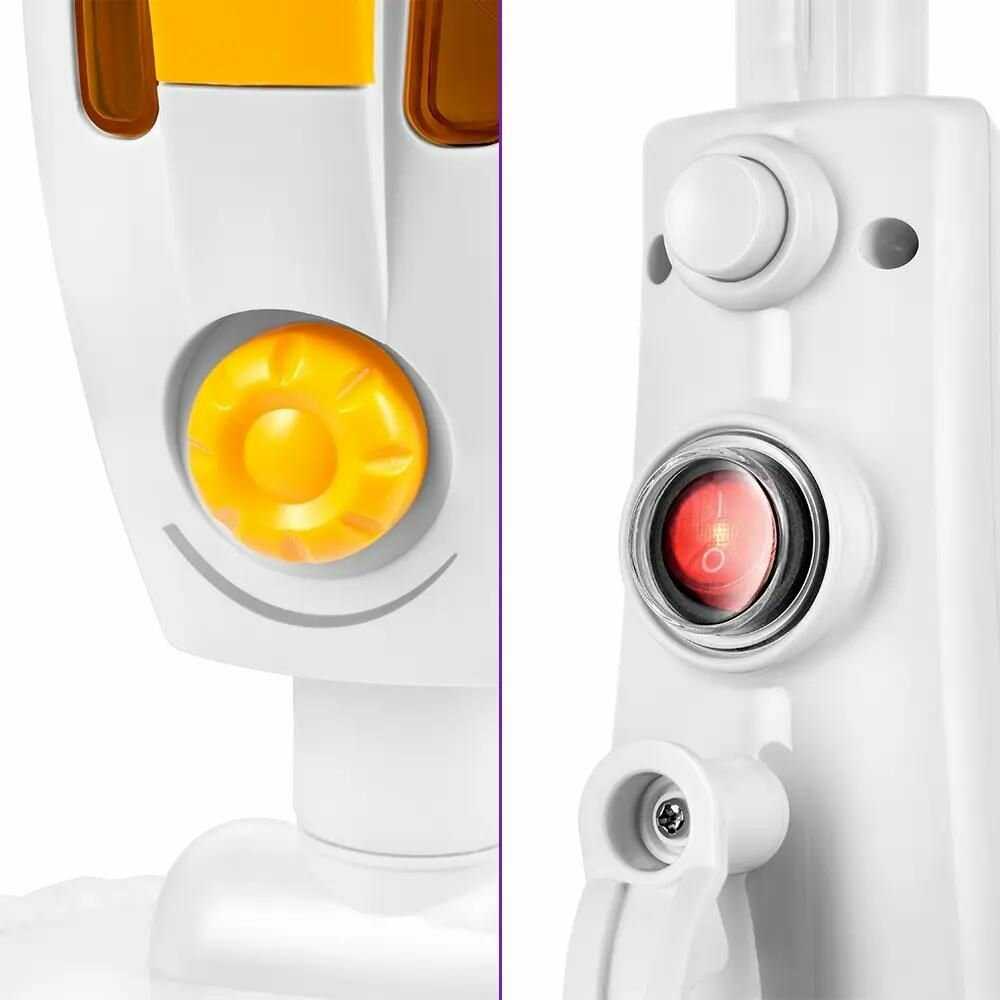 Швабра достигает рабочей температуры за 15-30 секунд, о чем сигнализирует индикатор нагрева. Пользователи отмечают непрерывную подачу пара после начального прогрева в течение 10 минут. Регулятор мощности на ручке позволяет адаптировать интенсивность пара для разных поверхностей. -
