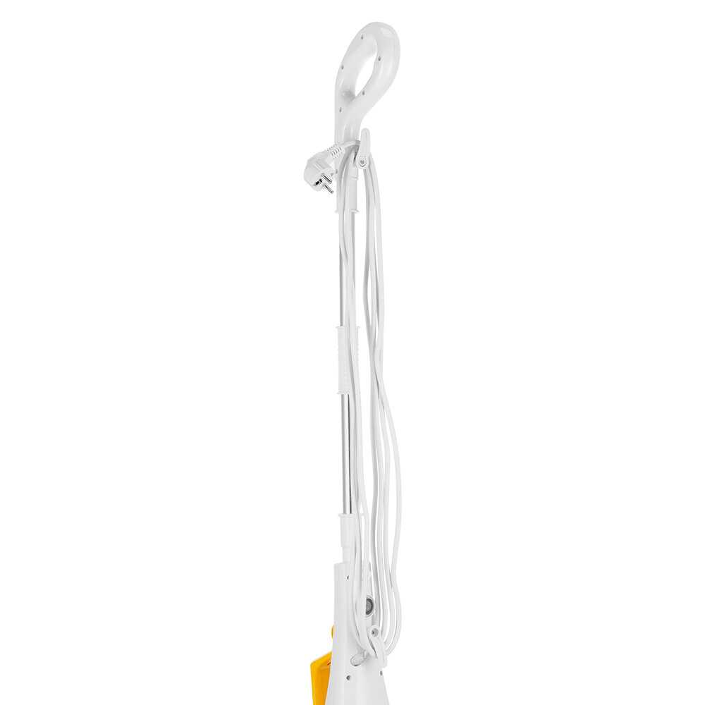 Швабра автономно стоит на подставке, а встроенный крючок позволяет компактно размещать шнур. Резервуар для воды съемный, что упрощает слив остатков. Для продления срока службы необходимо регулярно очищать фильтры от накипи и использовать только дистиллированную воду. -