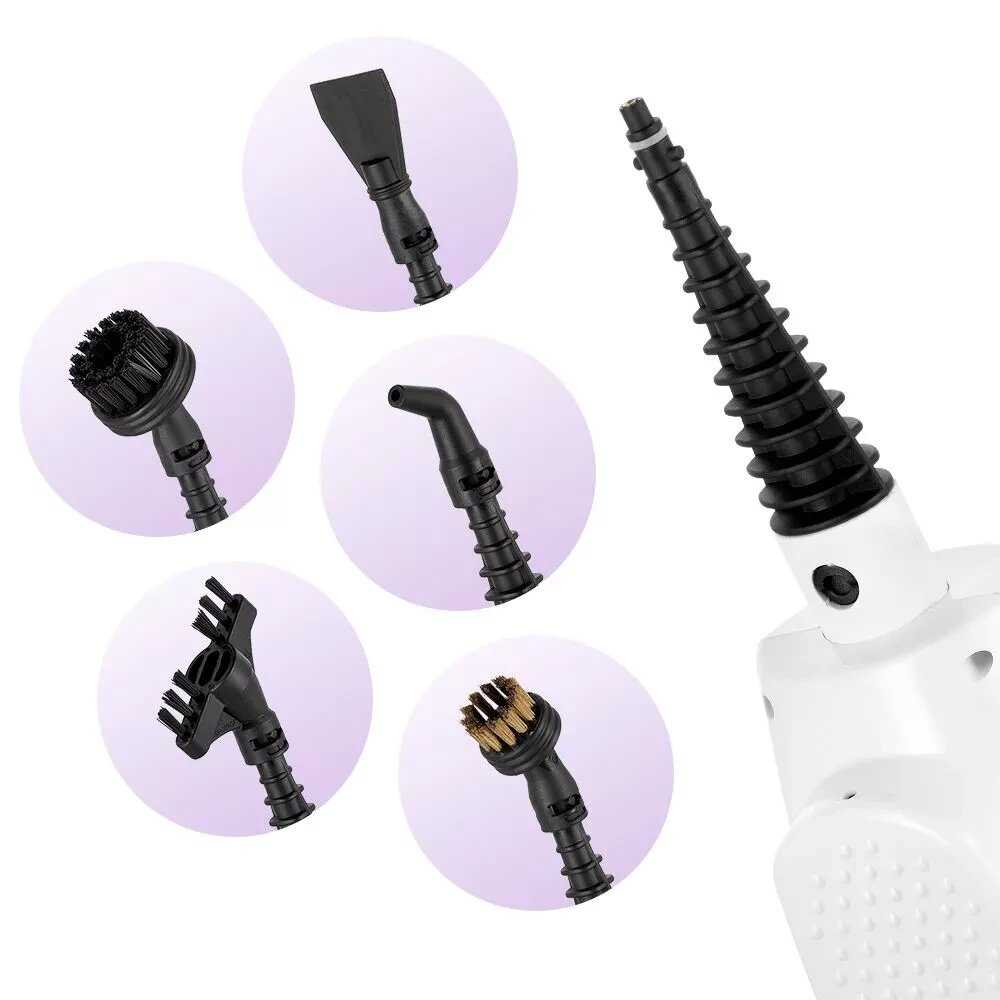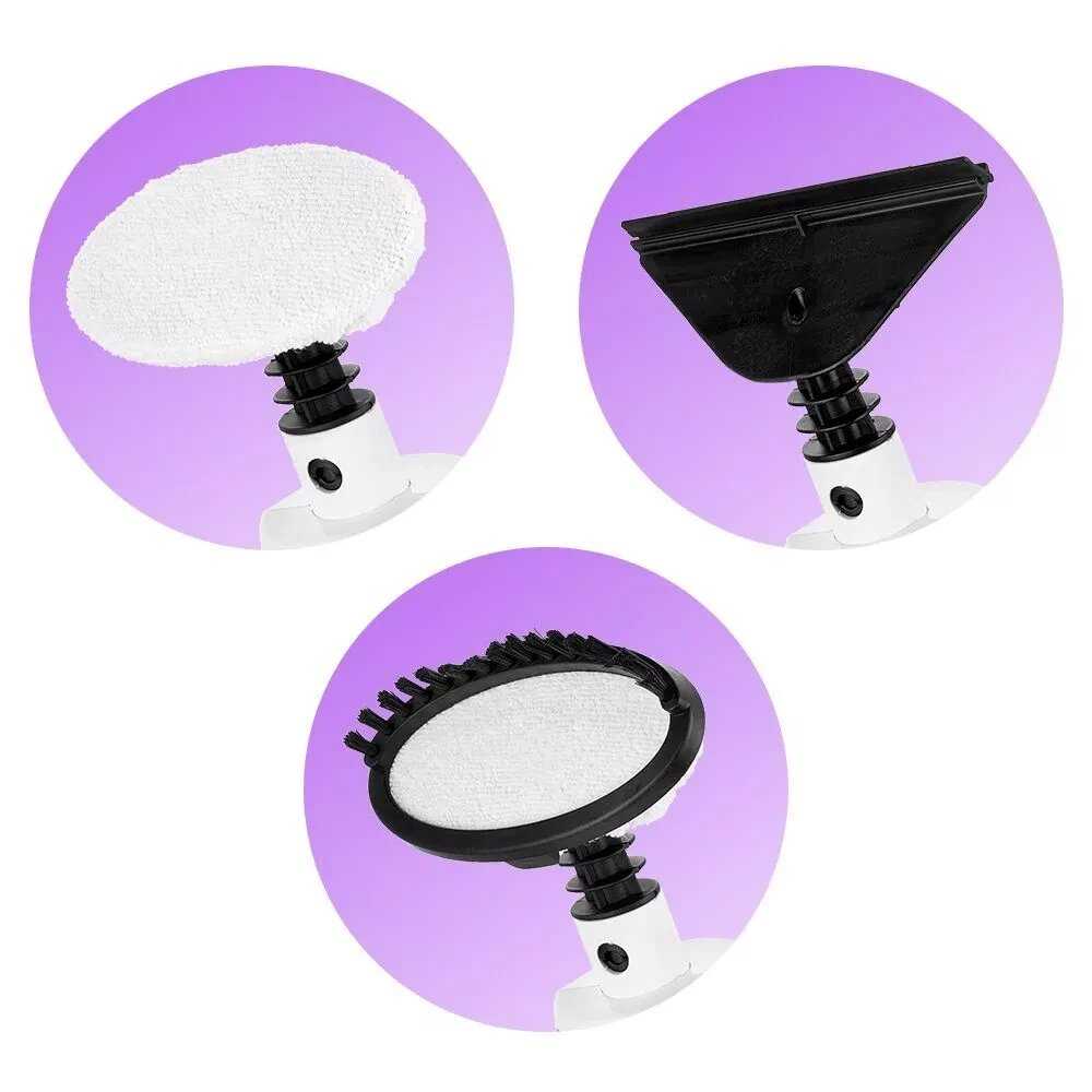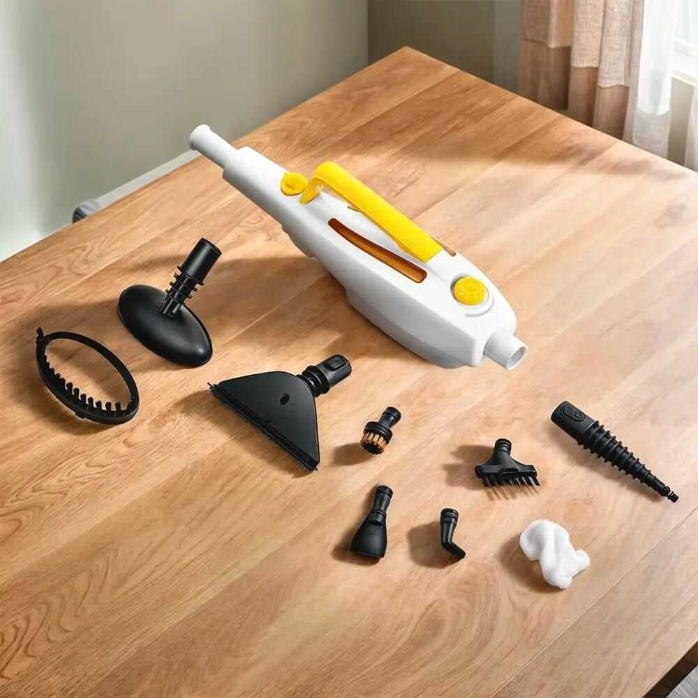 В комплекте предусмотрены специализированные насадки для ковров, окон, плитки, мягкой мебели и одежды. Щелевая насадка эффективно удаляет грязь из межплиточных швов, а скребок справляется с застарелыми пятнами на стеклокерамике. Для зеркал и окон рекомендуется сразу протирать поверхности сухой тканью во избежание разводов. -