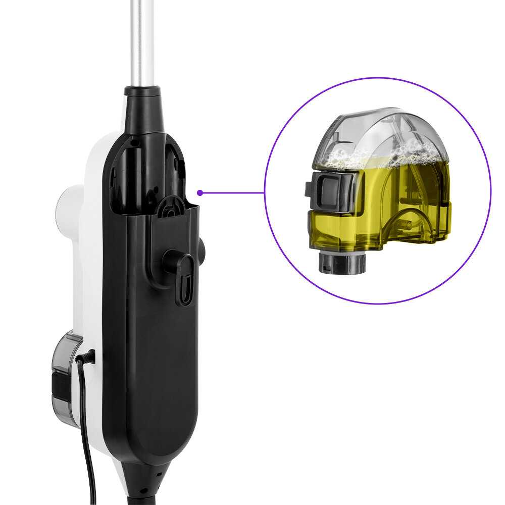 Резервуар на 50 мл – уникальная для сегмента особенность. Он дозированно подаёт раствор, но требует точного разведения. При концентрации выше 25% средство образует липкую плёнку на полу. Некоторые пользователи вообще отказались от химии, используя только пар. -