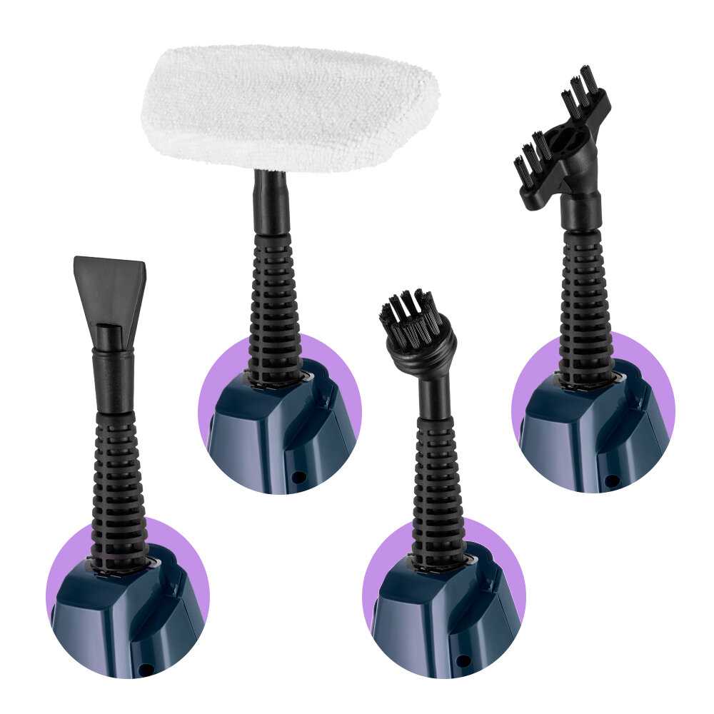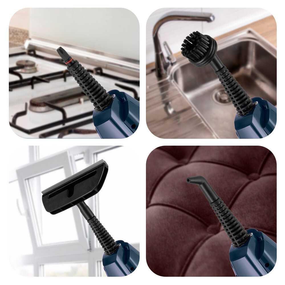 - Насадки подходят для полов, швов плитки, окон, мебели, ковров и отпаривания одежды, что позволяет очищать разные поверхности одним устройством.
