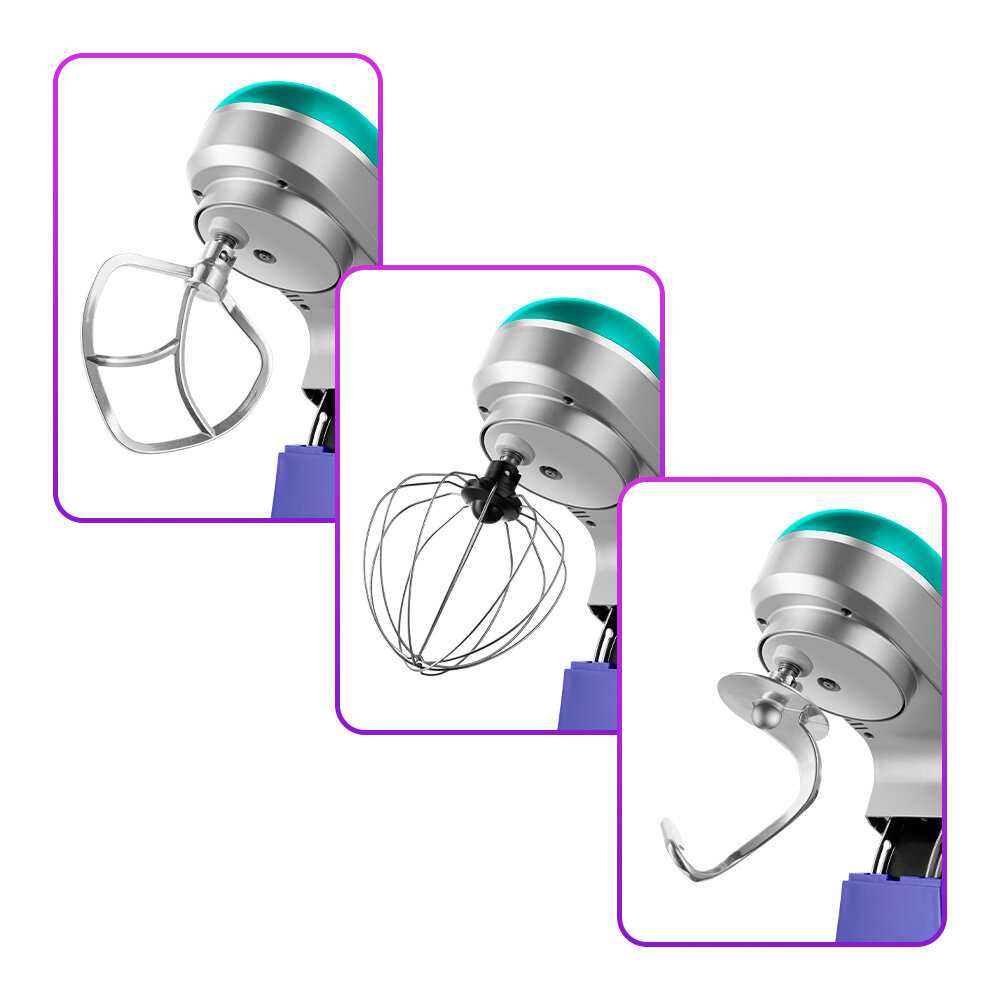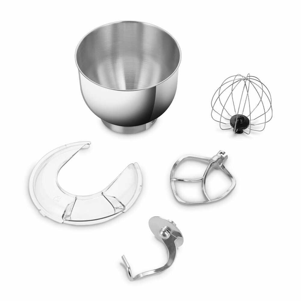 Лаконичный дизайн, съёмная чаша идёт на 5.5л, что позволяет сделать большой замес. В комплекте идёт три насадки, для разных целей, и для теста, и для крема, и для смешивания.