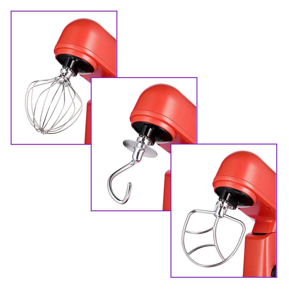- 3 металлические насадки (венчик с плотными прутьями, крюк для теста, лопатка) покрывают все базовые задачи: взбивание, замес, смешивание.