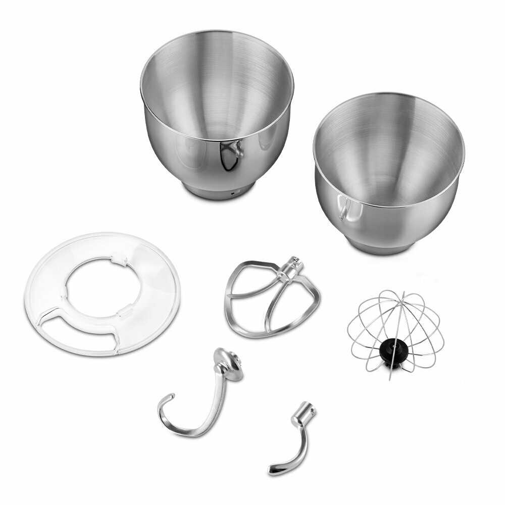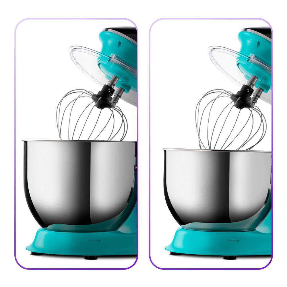 - + мощный планетарный миксер, хорошо справляется с густым тестом, взбиванием белков и кремов. Особенно удобен благодаря подогреву чаши и наличию сразу двух чаш (6 и 7 литров), что делает его универсальным помощником на кухне. Работает стабильно, крепко стоит на столе, насадки легко снимаются и моются. Дизайн стильный, управление простое, скоростей достаточно.
