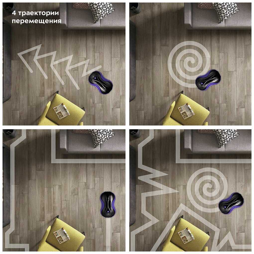 Пылесос перемещается по хаотичному алгоритму без построения карты помещения, что подтверждается многочисленными наблюдениями пользователей. Он часто проезжает по одним участкам многократно (до 15 раз по отзывам), при этом может игнорировать отдельные углы или зоны. Для улучшения качества уборки рекомендуется предварительно убирать провода и мелкие предметы. -