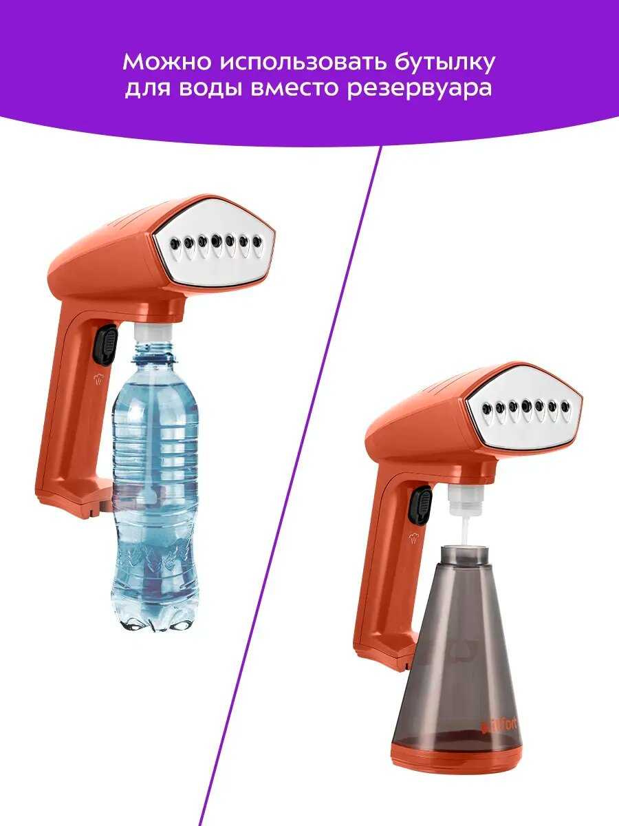 Легкий, небольшой, да еще и можно свою бутылку вставлять. мне колбы в комплекте хватило на штаны и блузку. они были очень мятые. Стали как из магазина- поглаженные! Мощный и хорошо проглажевает, это доставляет удовольствие) - - Пока не нашла, может обнаружу во время дальнейшего пользования