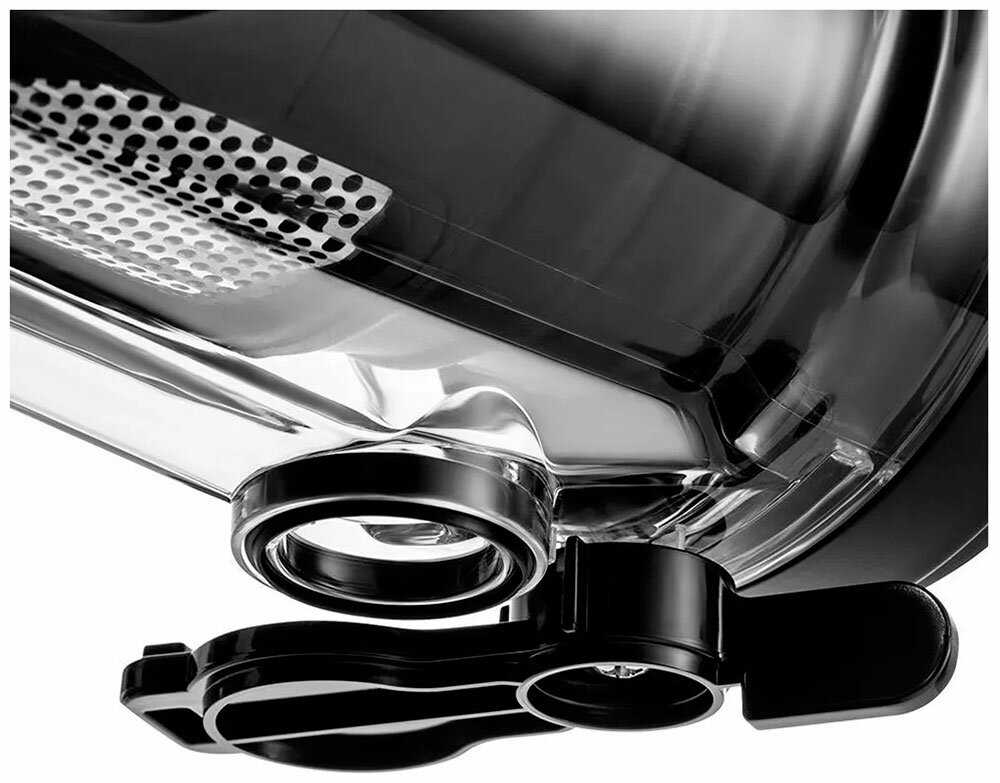 Ключевые функции: две скорости (для твердых/мягких продуктов), реверс для устранения заторов и широкая загрузочная горловина (75 мм), куда помещаются некрупные яблоки целиком. Фиксация деталей реализована через надежные защелки, но верхняя часть не снимается, что усложняет ручную мойку узких мест. -