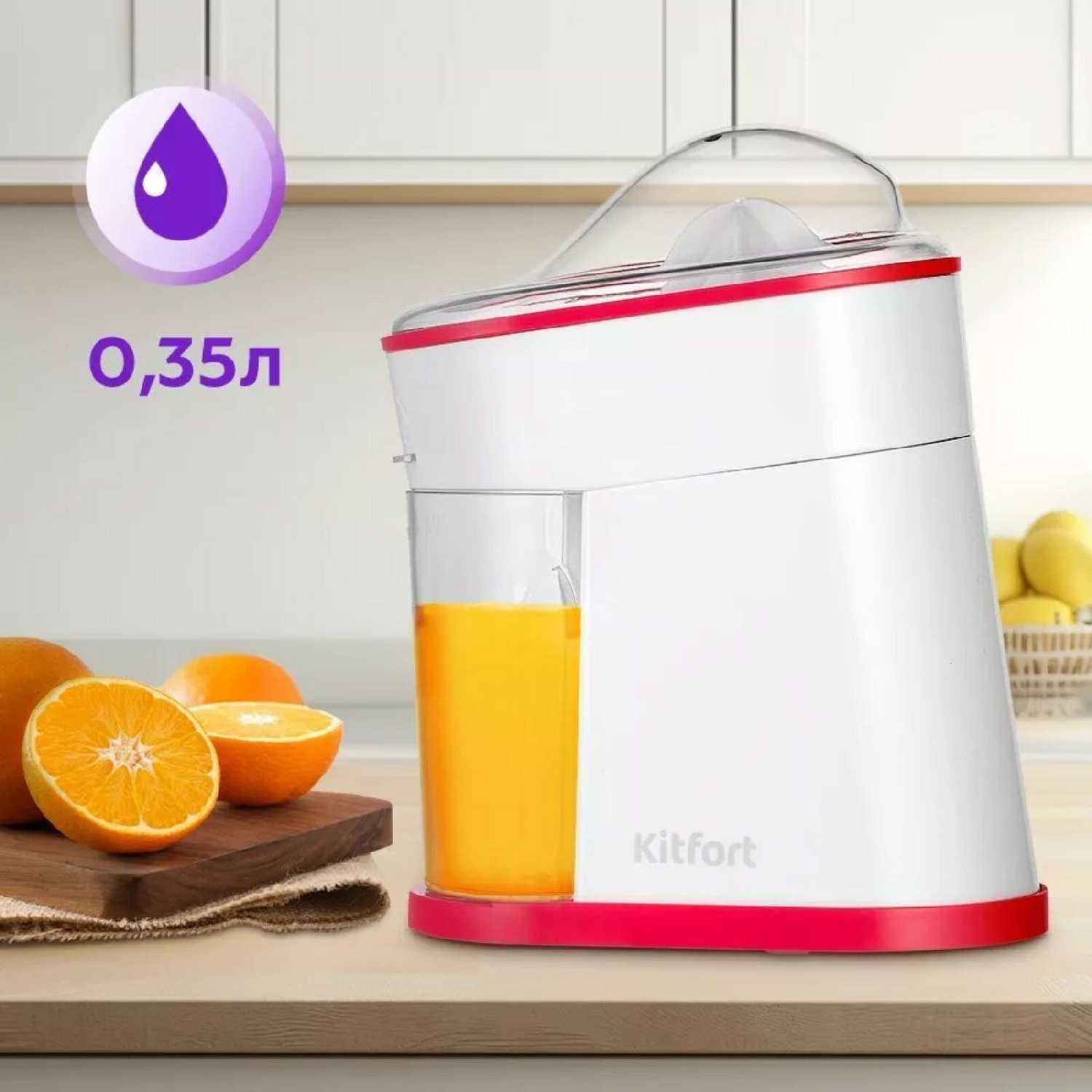 Соковыжималка для цитрусовых Kitfort КТ-1150-1 приятно удивила своей простотой и удобством в использовании. Устройство компактное, легкое, а яркий бело-малиновый дизайн делает его настоящим украшением кухни. Съемный резервуар объемом 0.35 л с градуированной шкалой удобен для точного измерения количества сока, а противокапельная система позволяет избежать лишнего беспорядка. Механическое управление и вращение конуса в двух направлениях обеспечивают равномерный отжим, справляясь даже с плотными цитрусовыми. Отдельно стоит отметить легкость очистки – благодаря съемным элементам процесс мытья занимает всего пару минут.