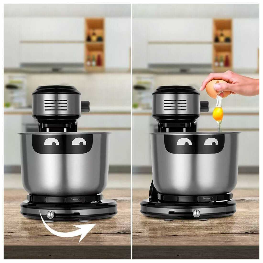 Съемный миксер (из-за особенностей конструкции это супер, так как 1 яйцо на подставке не взбить, только если взять миксер в руки)