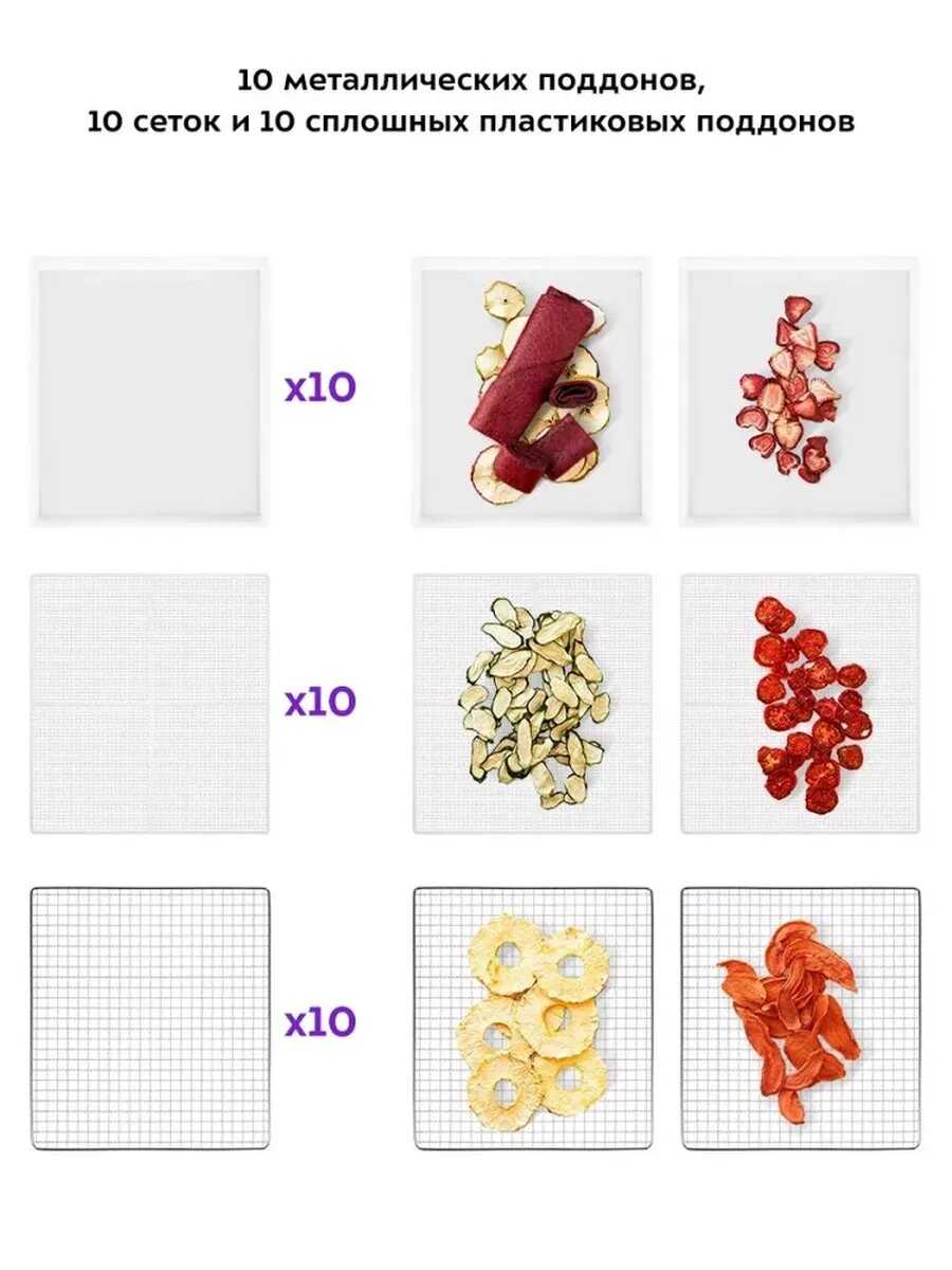 - + - Большой вместительный дегидратор, в комплекте полный набор: 10 решёток крупной сетки, 10 поддонов для пастилы и 10 пластиковых поддонов для мелкой сетки (для трав).