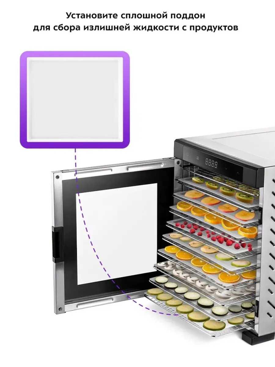 Лёгкая в управлении, работает тихо. В комплекте идут 10 металлических решётки, 10 пластиковых поддонов для пастилы, 10 сеток для овощей и фруктов