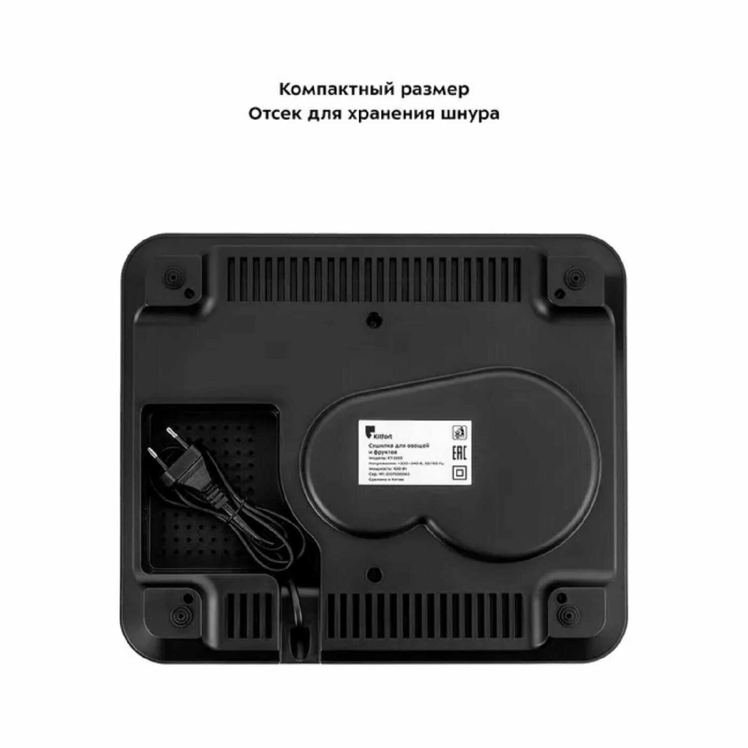 - Кабельный отсек в основании корпуса обеспечивает аккуратное хранение сетевого шнура длиной 1,2 м, предотвращая его повреждение.