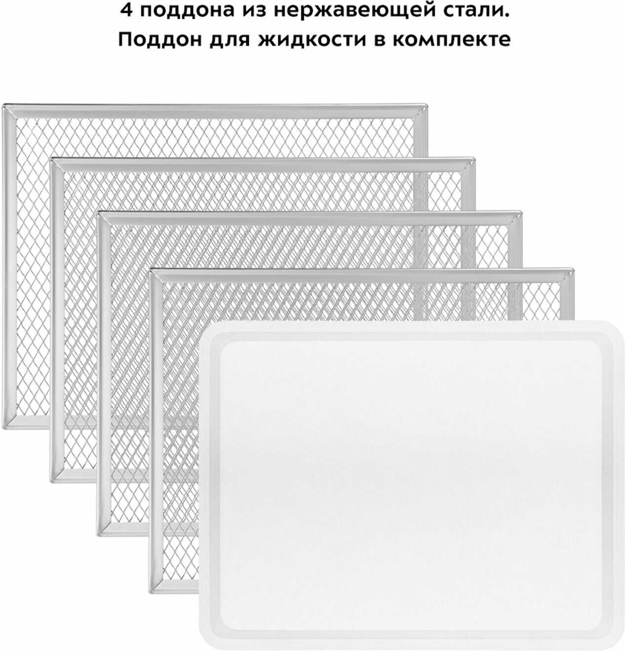 Все рабочие поддоны выполнены из нержавеющей стали, что неоднократно подчеркивается в отзывах как значительное преимущество. Металлические решетки не впитывают запахи, отличаются прочностью и долговечностью по сравнению с пластиковыми аналогами. Важно, что их можно безопасно мыть в посудомоечной машине, что существенно упрощает уход после сушки жирного мяса или липких фруктов. -