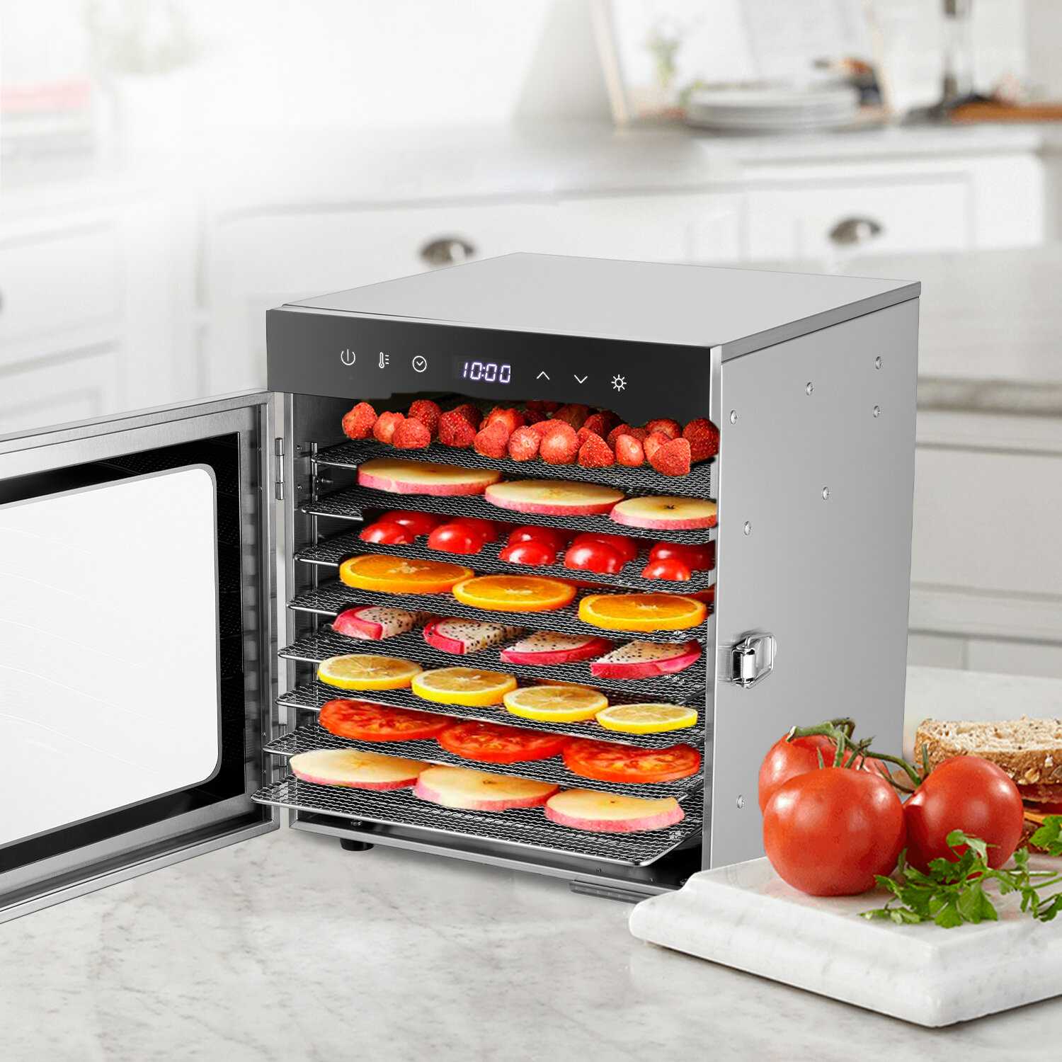 Универсальность в примененииДегидратор эффективен для широкого спектра продуктов: мясо (говядина, курица, свинина), рыба, овощи (томаты, кабачки, лук), фрукты (яблоки, бананы, груши), грибы, зелень и даже специализированные задачи — сушка пластика для 3D-печати или ферментация табака. Для мясных изделий особенно ценны рецепты из инструкции, гарантирующие оптимальную консистенцию (например, джерки с соевым соусом). При сушке фруктов сохраняется естественный цвет без потемнения, в отличие от духовки. Однако объем загрузки ограничен: максимальная вместимость — 0.7 кг мяса или 4-5 средних фруктов за цикл, что недостаточно для больших партий. Жидкости (йогурт, фруктовые пюре для пастилы) требуют использования пластикового поддона, но его малая площадь (один в комплекте) осложняет приготовление больших порций.