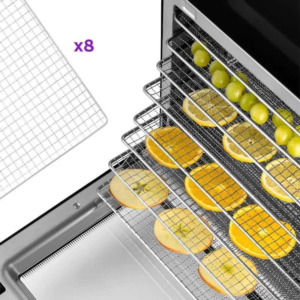 2) Восемь поддонов. Это достаточно для бытового использования. Приведу пример. У меня ~2кг груш занимают 3 поддона, значит 1кг занимает 1.5 поддона. Соответственно, 8 поддонов \ на 1.5 = 5.3 кг груш всего влезает в сушилку.