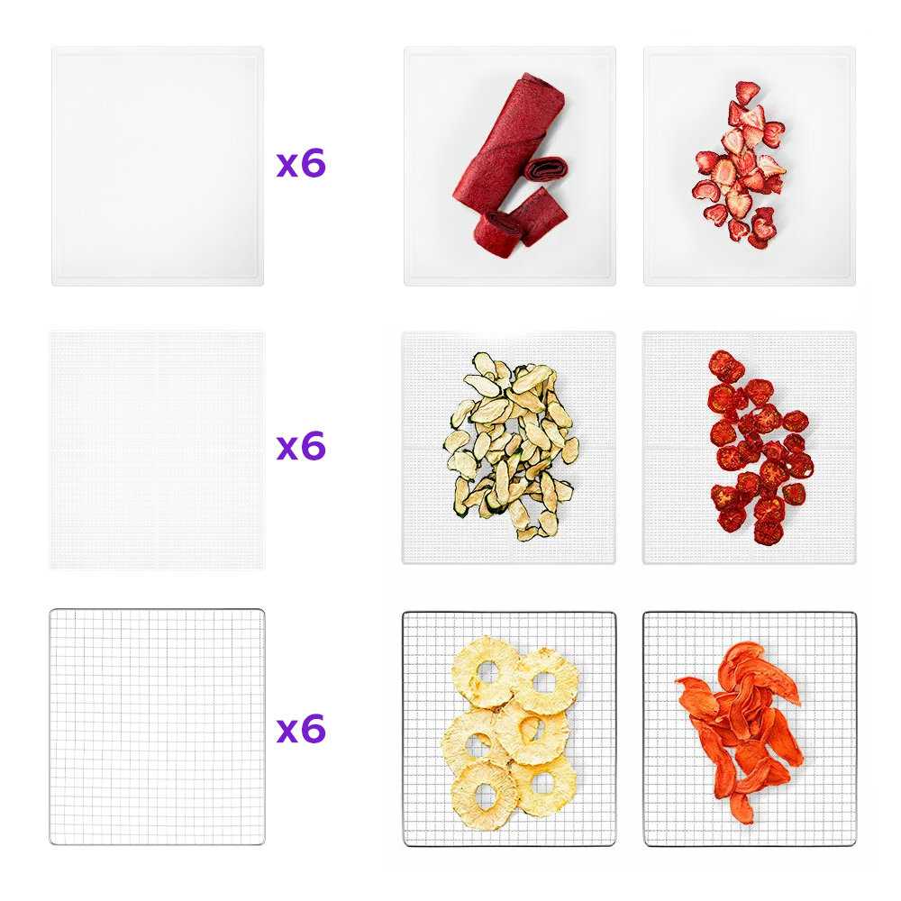 - + В комплекте: металлический поддон - 6 шт. (крупная нарезка), сетка пластиковая - 6 шт. (зелень, травы, мелкие ягоды), пластиковый сплошной поддон - 6 шт. (водянистые фрукты, пастила).