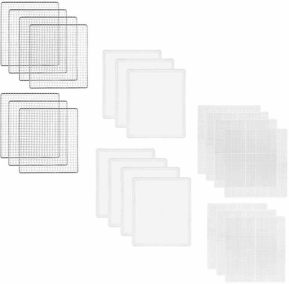 Стандартная комплектация включает три типа поддонов: 7 металлических сеток для твердых продуктов, 7 силиконовых ковриков для пастилы и жидкостей, 7 пластиковых сеток для мелких кусочков. Силиконовые элементы устойчивы к деформации в отличие от пластиковых аналогов в предыдущих моделях. Все лотки моются в посудомоечной машине, не впитывают запахи. Дополнительно предусмотрен магнит на дверцу, но внутренняя подсветка отсутствует. -