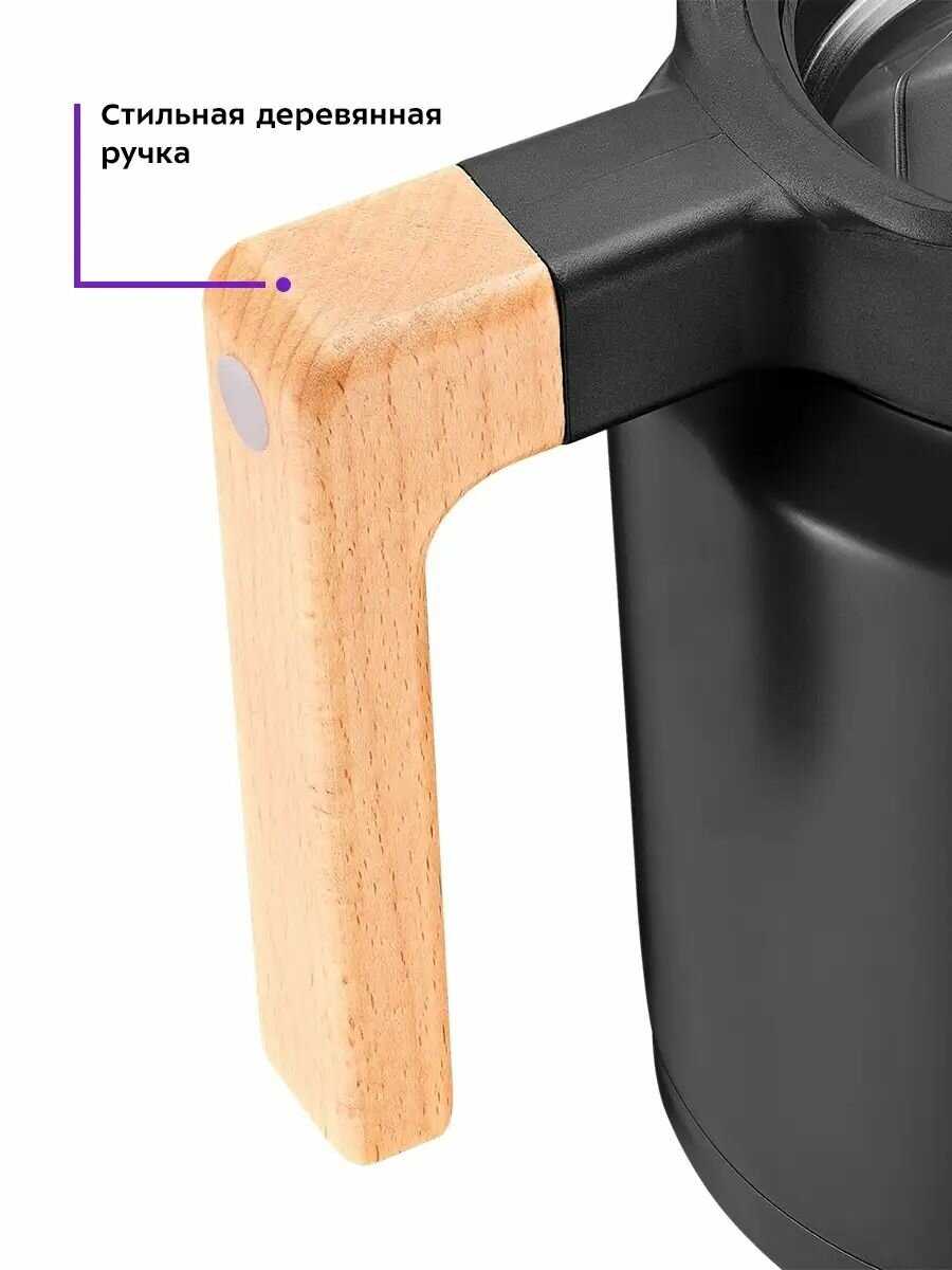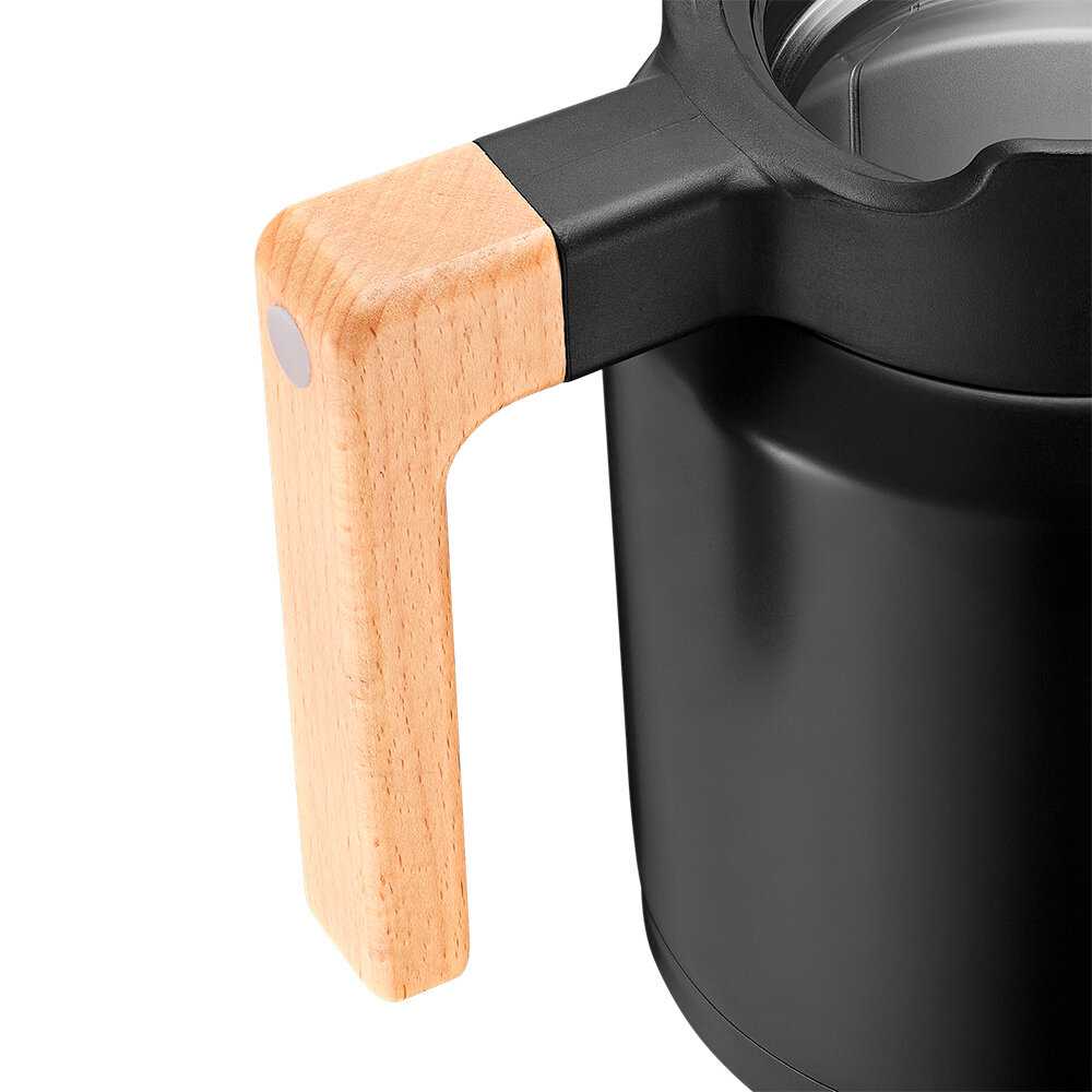 Конструкция термоса оптимизирована для удобства: система подачи напитка через нажатие рычажка на крышке обеспечивает аккуратную струю без протекания по корпусу. Широкое горло (диаметр ~7 см) позволяет комфортно мыть внутреннюю часть даже рукой небольшого размера, а металлическое ситечко для заварки плотно фиксируется внутри, хотя его наличие затрудняет визуальный контроль уровня воды. Объём 350 мл идеален для индивидуального использования (эквивалент 1.5 кружки), но маловат для группового чаепития. Вес ~450 г и компактные габариты позволяют носить термос в сумке или рюкзаке без дискомфорта, а деревянная ручка из бука (не анонсированная в описании) получила особые похвалы за приятный тактильный отклик и эргономичность.