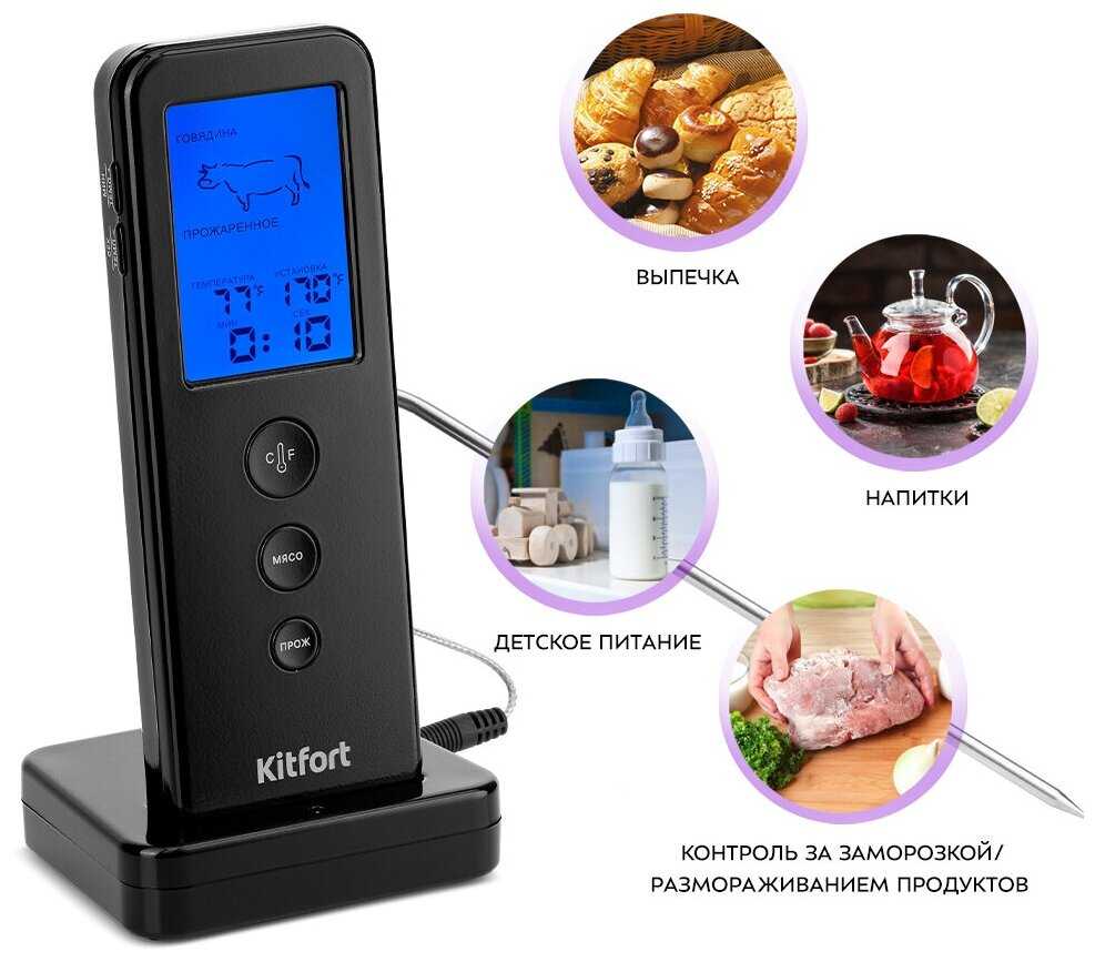 от говядины до рыбы. Установить степень прожарки. Можно устанавливать таймер как по времени, таки по температуре. Также, этот термометр мне помогает при перегоне самогона. Я могу заниматься своими делами при этом термометр будет со мной и оповестит при достижении определенной температуры. Очень доволен приобретением. Всем советую приобретать товары от Kitfort.