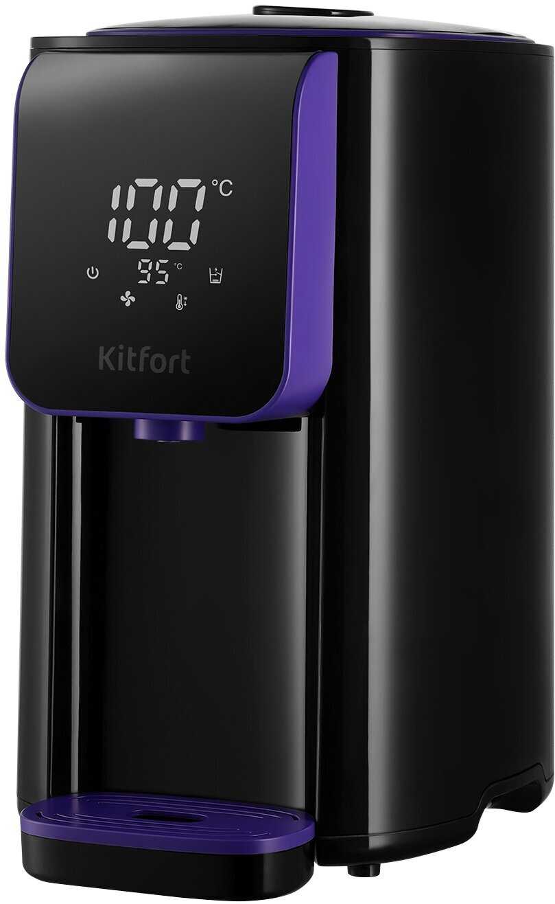 Термопот Kitfort выделяется уникальным чёрно-фиолетовым дизайном, который пользователи называют стильным и гармонично вписывающимся в любой интерьер. Многие отмечают, что устройство выглядит дорого и напоминает кофемашину, что делает его эстетичным украшением кухни или даже гостиной. Крышка полностью съёмная, что упрощает залив воды и чистку, а подставка для чашек с функцией сбора капель добавлена в конструкцию. Однако некоторые пользователи обратили внимание на нагрев внешних стенок при работе, что может быть неудобно при случайном касании. Пластиковый корпус, несмотря на приятную тактильность, склонен собирать пыль и отпечатки, а короткий несъёмный сетевой шнур (1 метр) ограничивает варианты размещения.