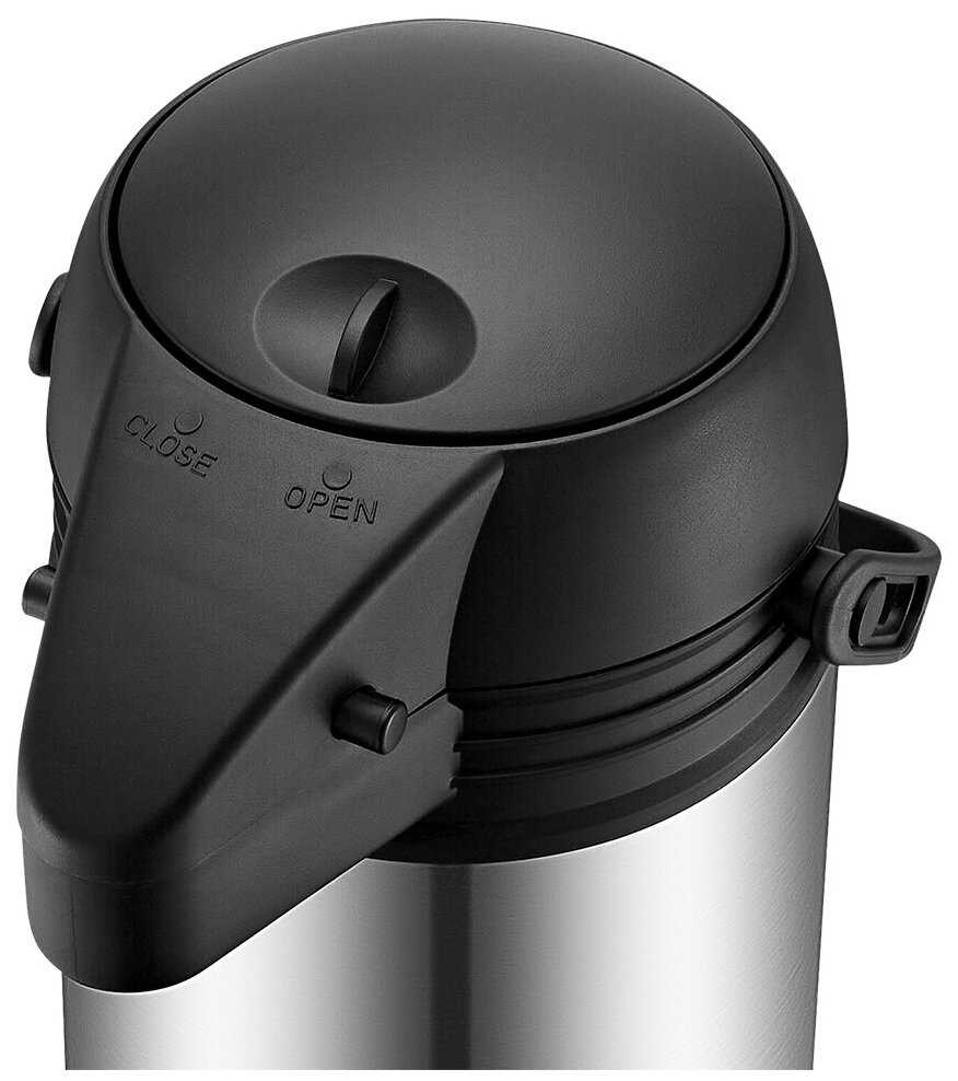 - Помпа снимает необходимость открывать термос: нажатие одной рукой позволяет наливать кипяток в чашку без контакта с паром.