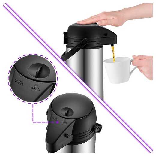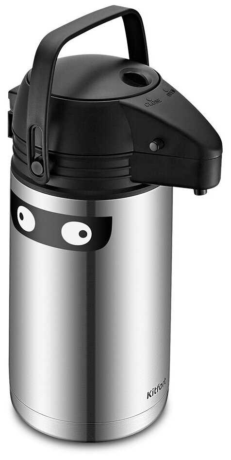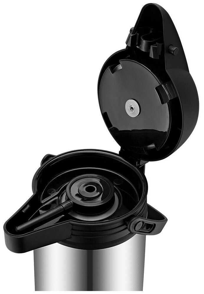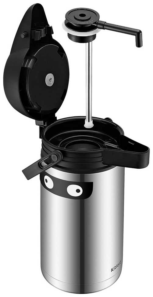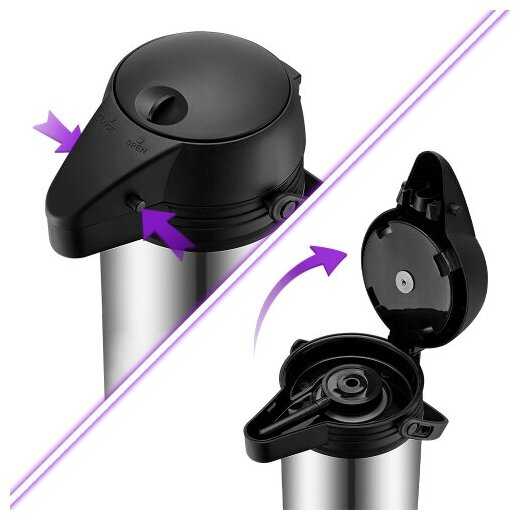 - Помпа снимает необходимость открывать термос: нажатие одной рукой позволяет наливать кипяток в чашку без контакта с паром.