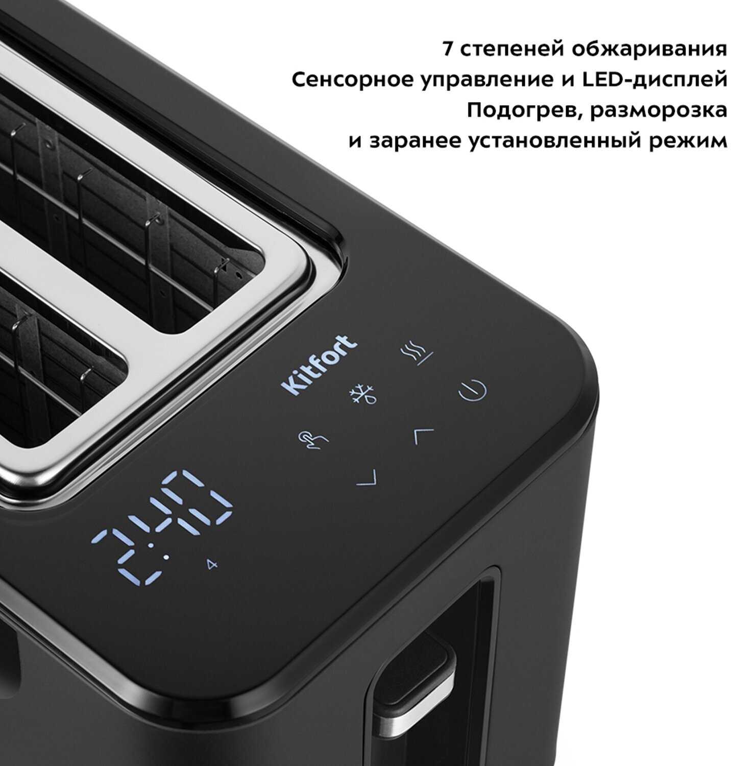 7 степеней поджарки хлеба, регулируется сенсорными кнопками.