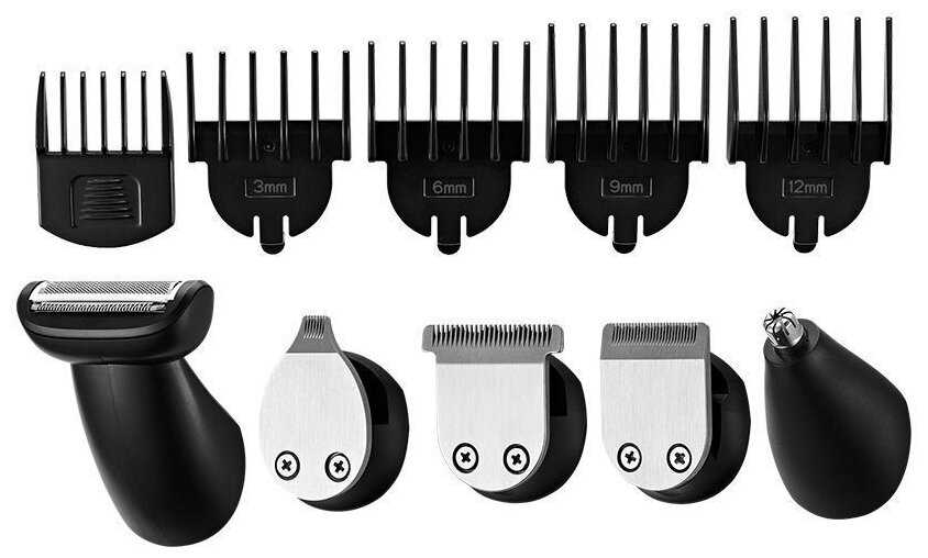 В комплекте присутствует множество насадок, включая гребни разной длины для стрижки волос, насадки для точной коррекции, а также специализированные триммерные головки для носа, ушей и бритья. Пользователи подтверждают, что каждая насадка выполняет свою функцию безукоризненно и позволяет проводить разнообразные процедуры. Наличие такого набора делает устройство многофункциональным. -