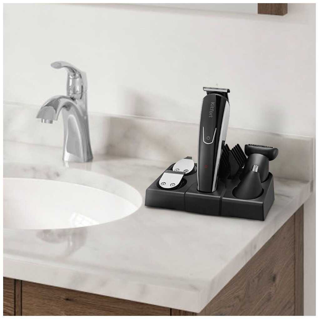 - Подставка вмещает триммер и основные насадки, предотвращая потерю аксессуаров и обеспечивая аккуратное хранение в ванной.