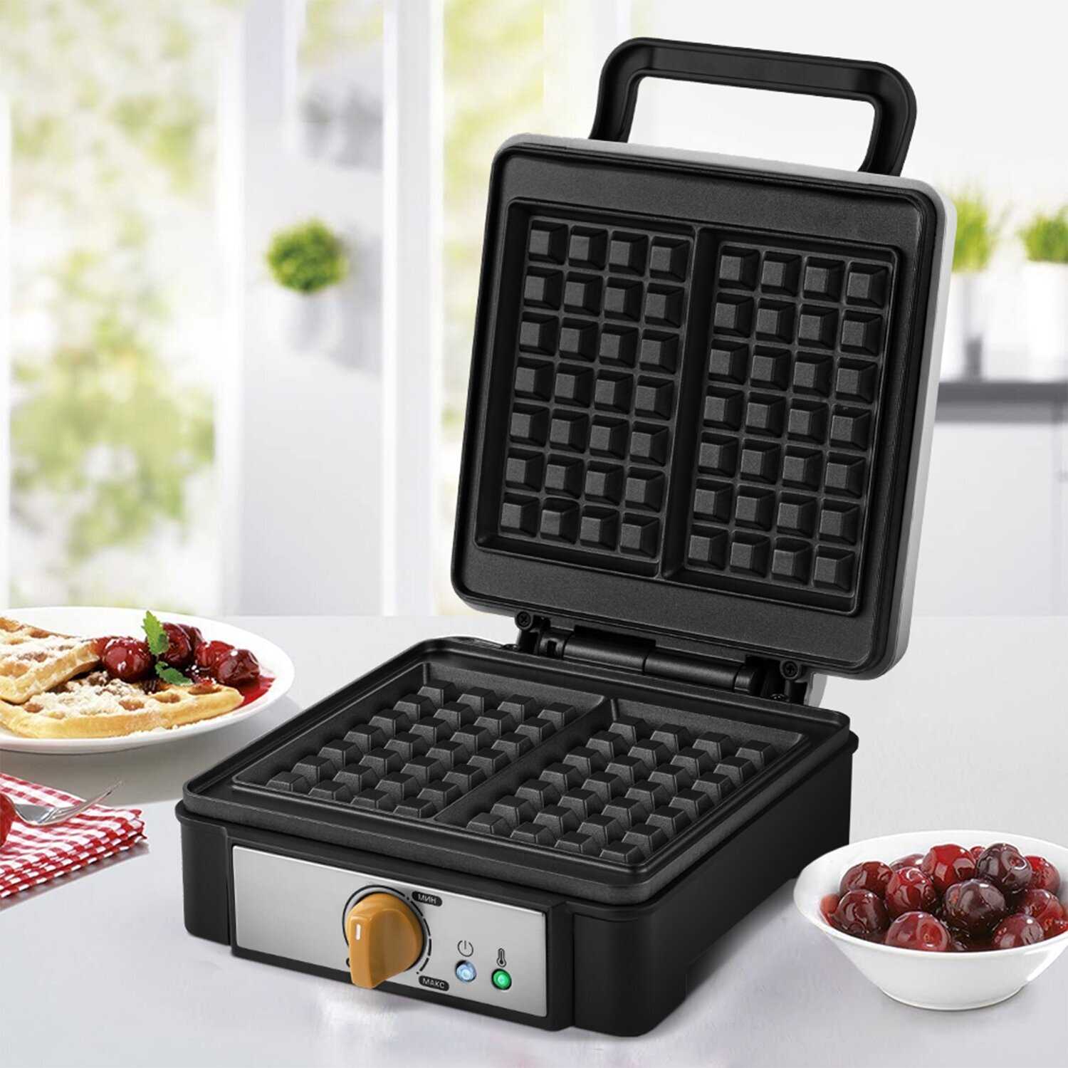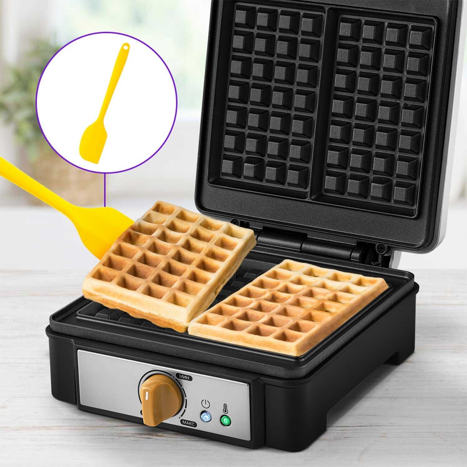 - Плавная регулировка температуры позволяет получать мягкие или хрустящие вафли.